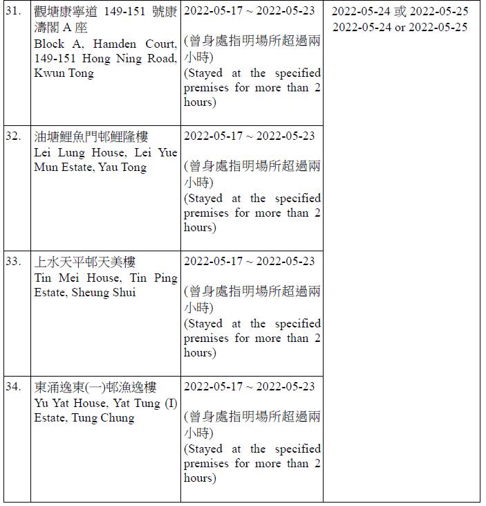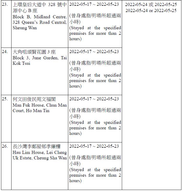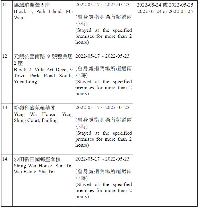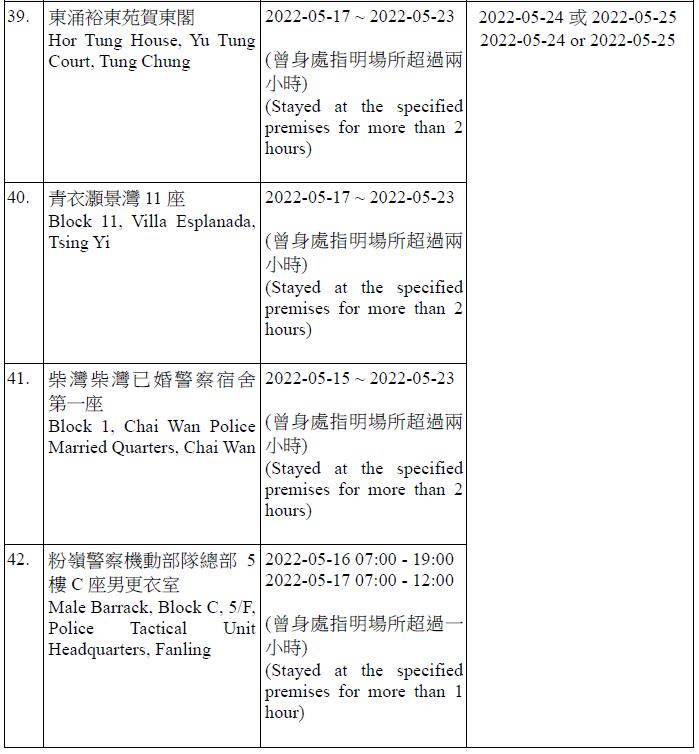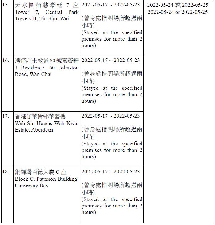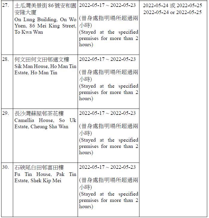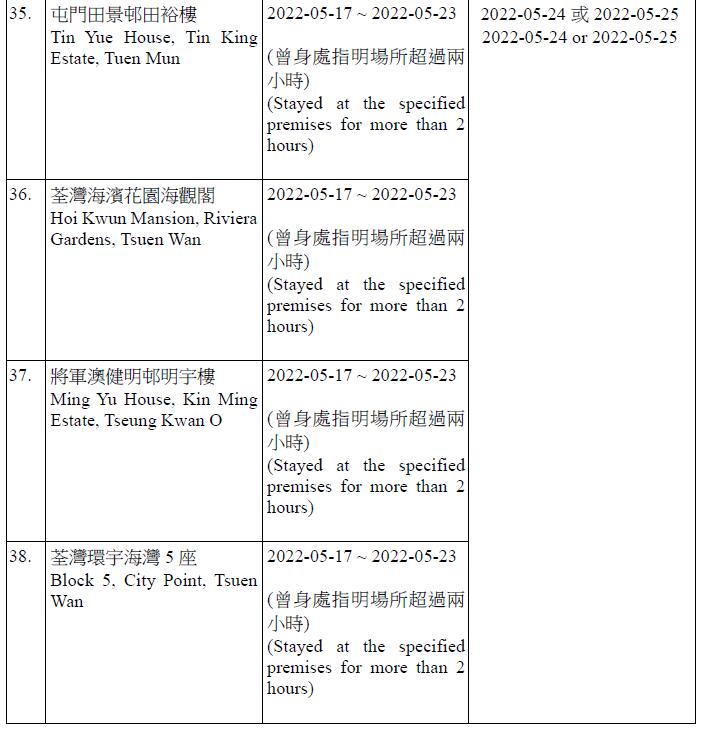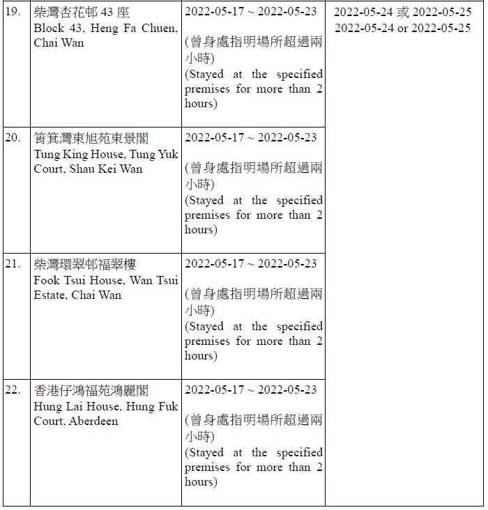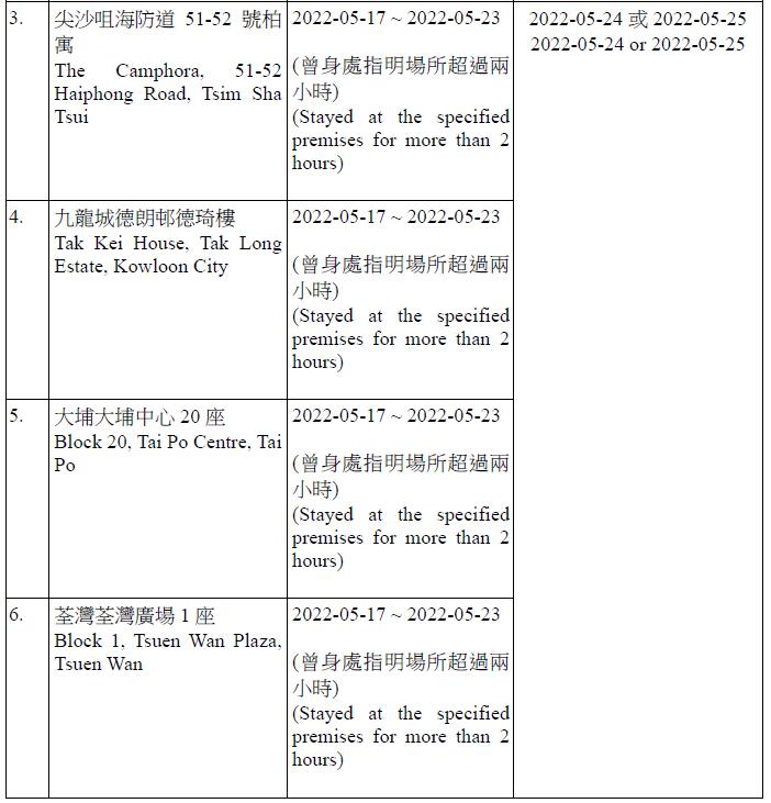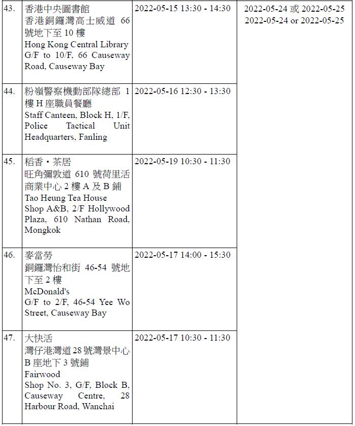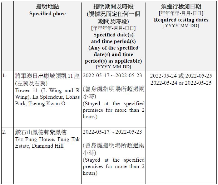 因應多宗陽性檢測個案,港府今晚就強制檢測公告刊憲,要求於指定期間曾身處49個指明地方的人士,接受核酸檢測,包括將軍澳日出康城領凱11座 (左翼及右翼)、鑽石山鳳德邨紫鳳樓、尖沙咀海防道51-52號柏寓、九龍城德朗邨德琦樓、大埔大埔中心20座、荃灣荃灣廣場1座、粉嶺花都廣場10座、粉嶺警察機動部隊總部5樓C座男更衣室,及香港中央圖書館香港銅鑼灣高士威道66號地下至10樓等。