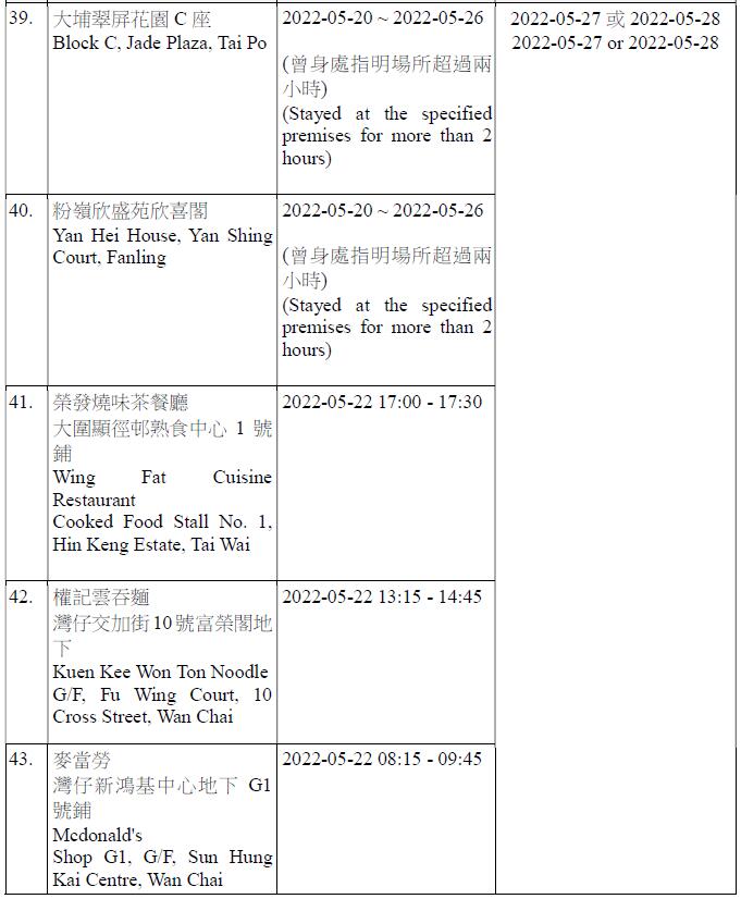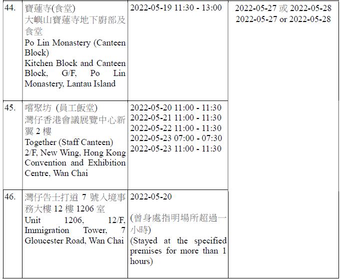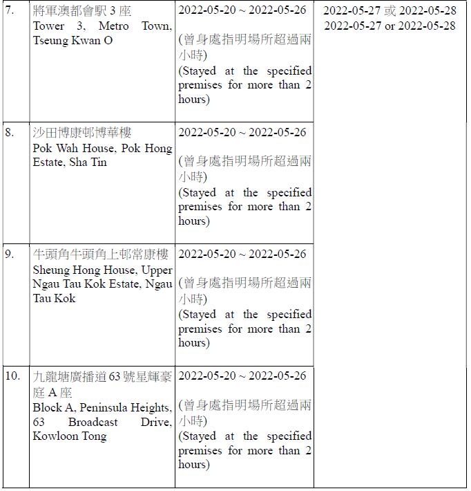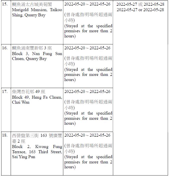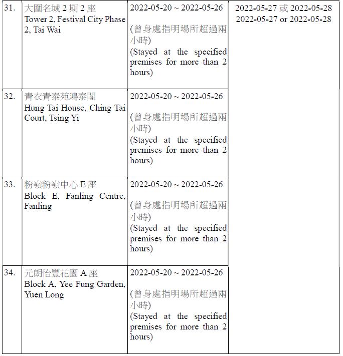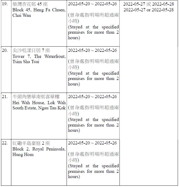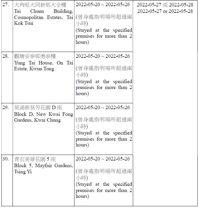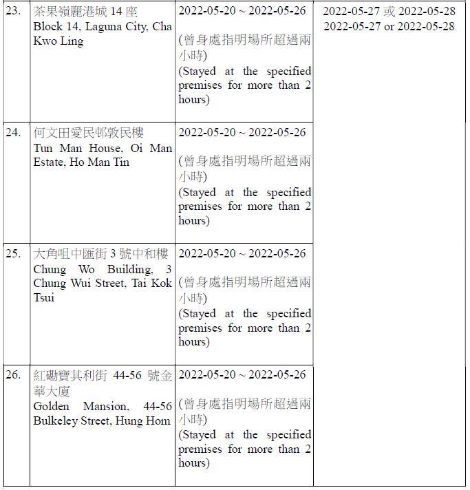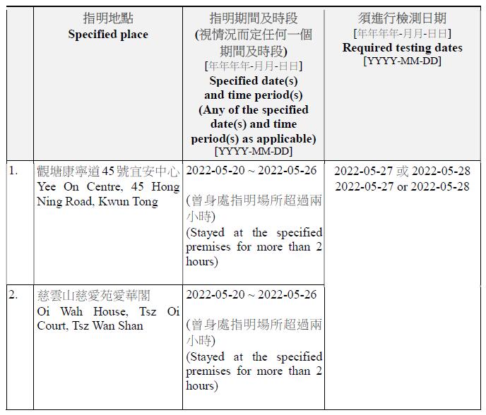 因應多宗陽性檢測個案,港府今晚(26日)就強制檢測公告刊憲,要求於指定期間曾身處46個指明地方的人士,接受核酸檢測,包括觀塘康寧道45號宜安中心、慈雲山慈愛苑愛華閣、旺角花園街76A號金國中心、石硤尾石硤尾邨美映樓、葵涌葵涌邨夏葵樓、屯門蝴蝶邨蝶翎樓、將軍澳都會駅3座、沙田博康邨博華樓、牛頭角牛頭角上邨常康樓及九龍塘廣播道63號星輝豪庭A座等。