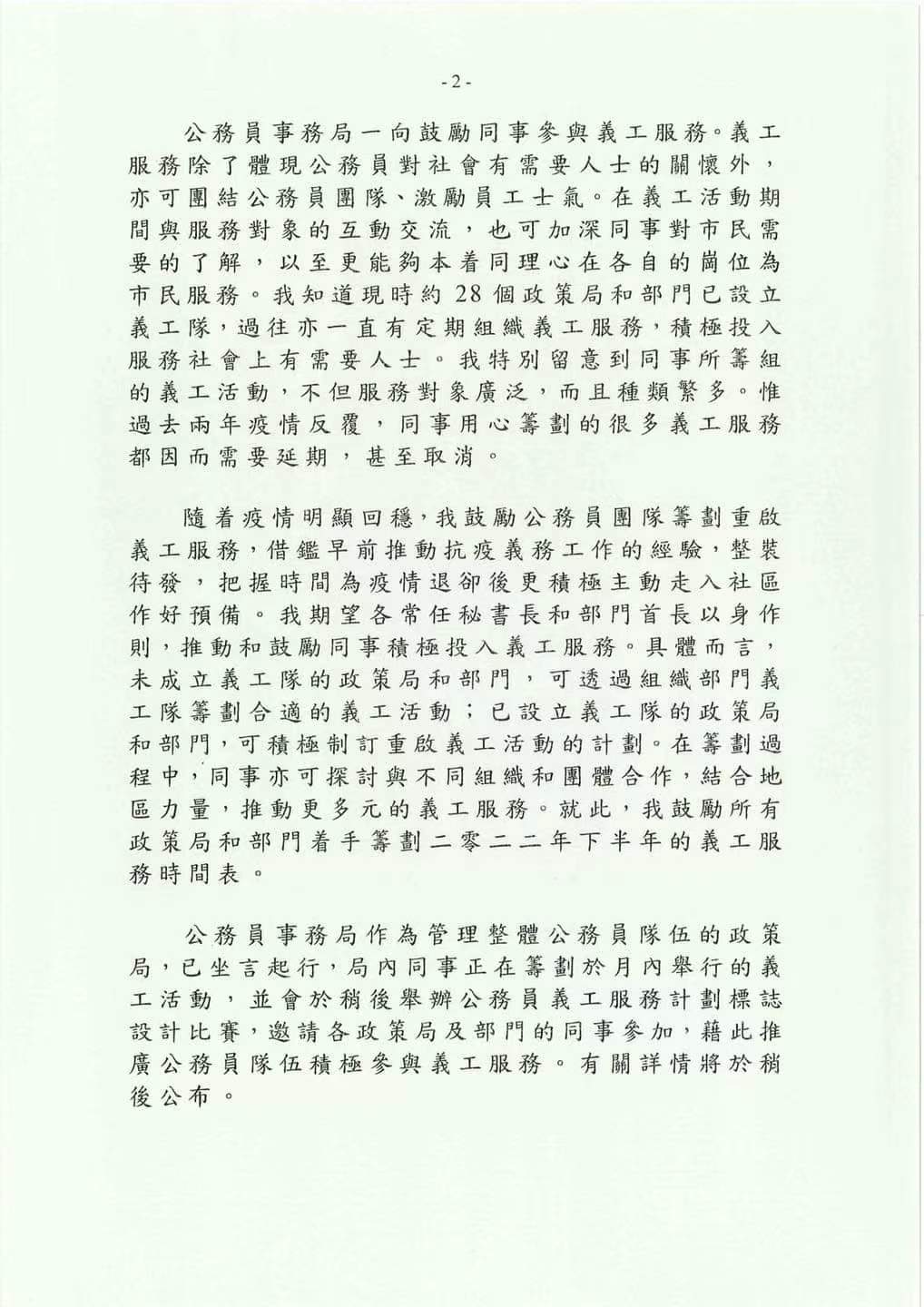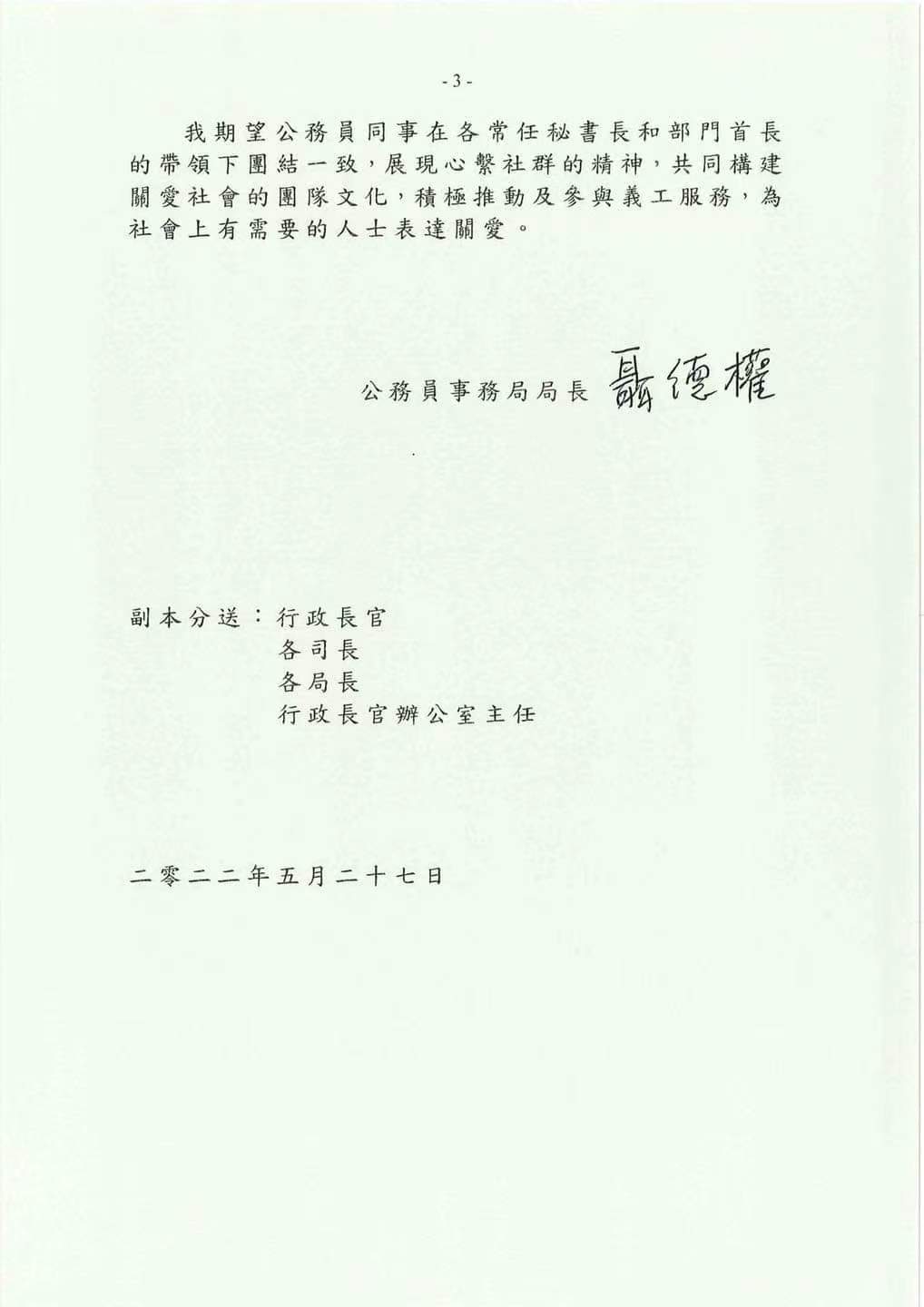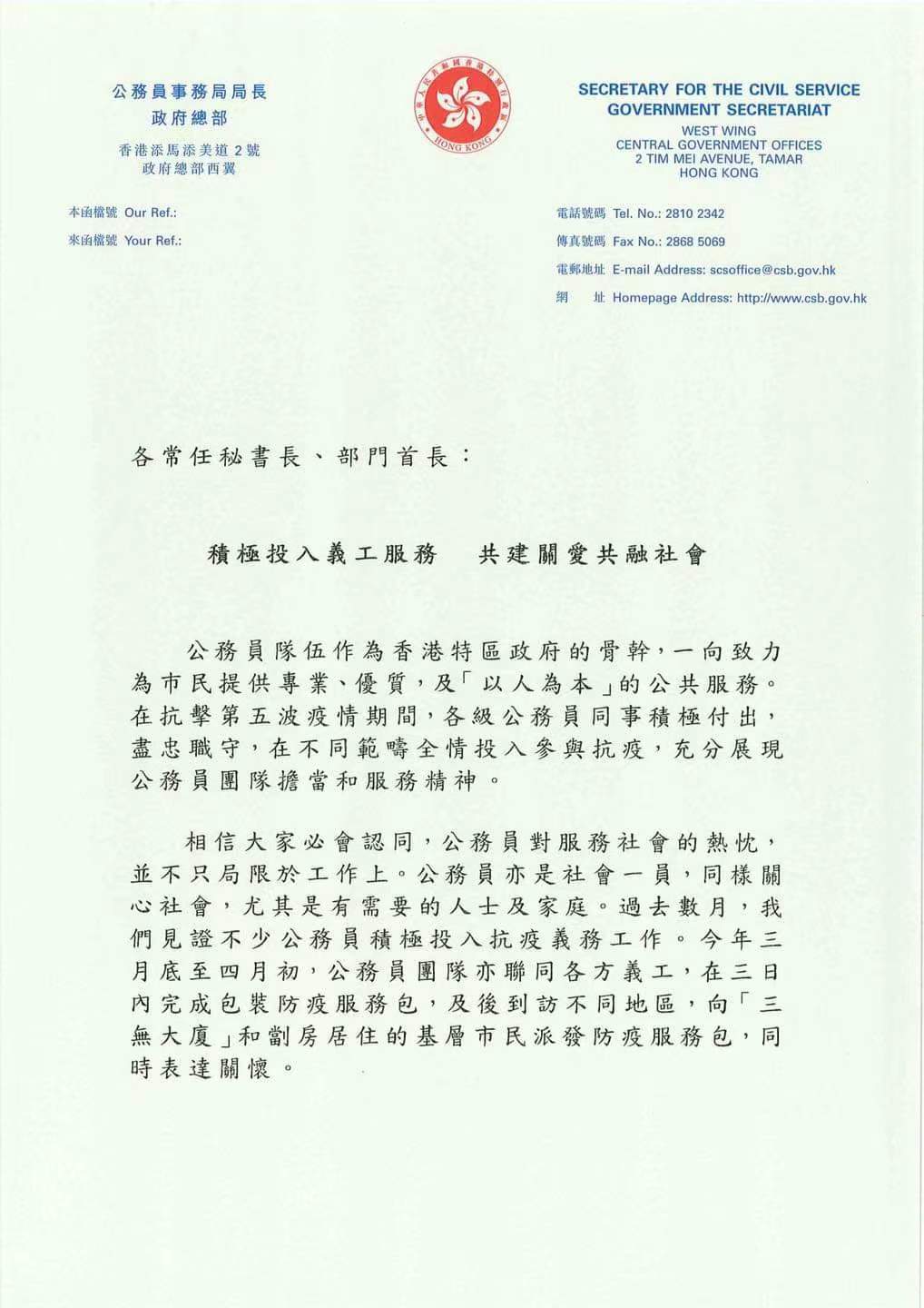 公務員事務局局長聶德權在社交平台表示,今天已向一眾常任秘書長及部門首長發信,期望他們以身作則,推動和鼓勵同事公務員積極投入義工服務。
