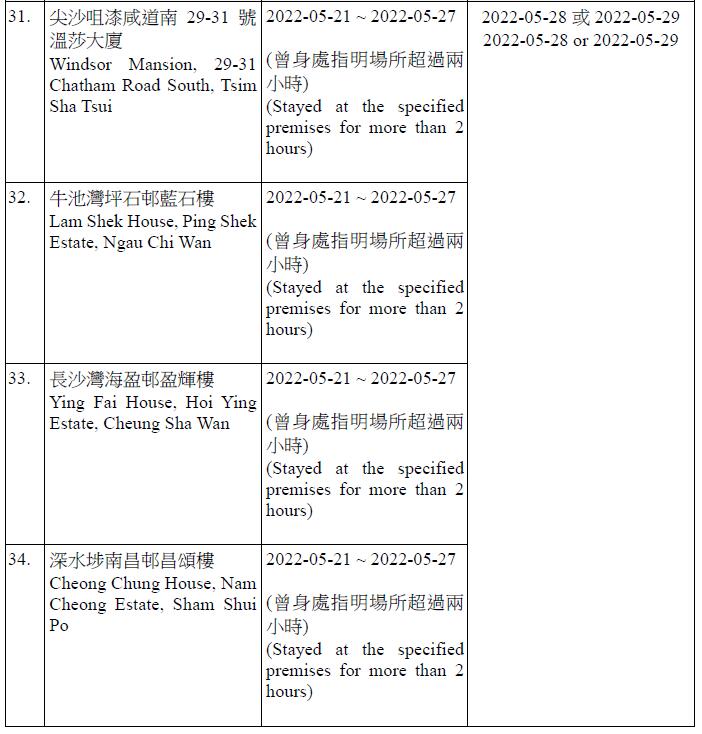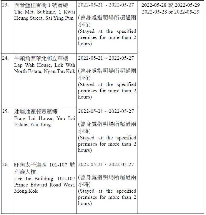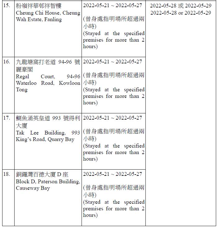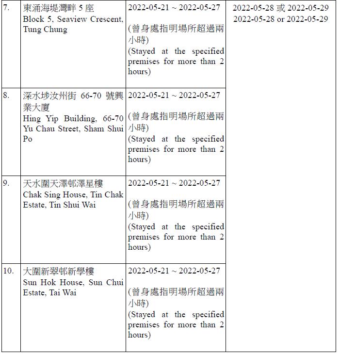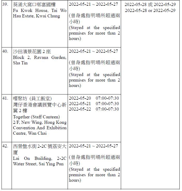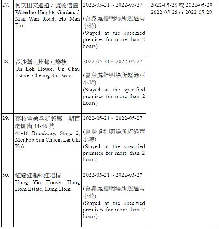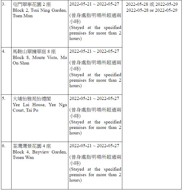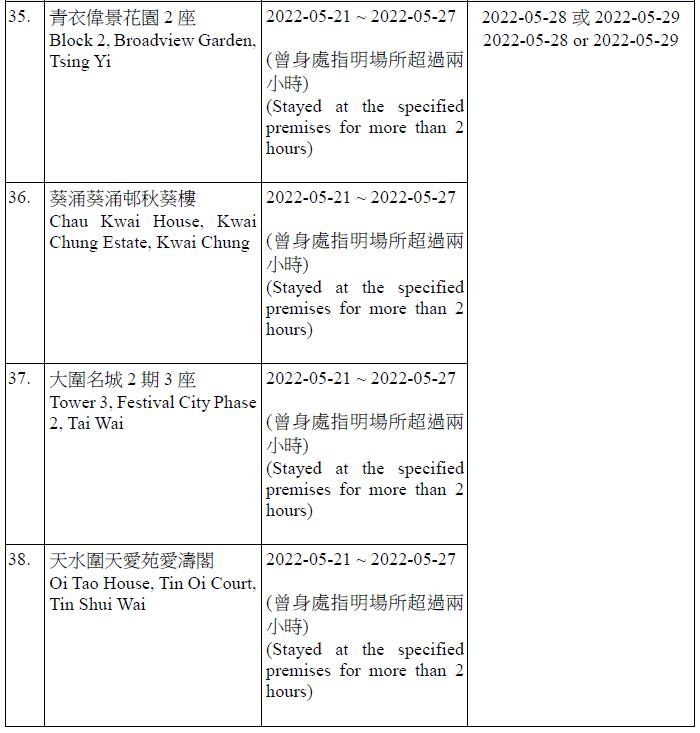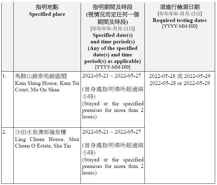 因應多宗陽性檢測個案,港府今晚(27日)就強制檢測公告刊憲,要求於指定期間曾身處42個指明地方的人士,接受核酸檢測,包括馬鞍山錦泰苑錦盛閣、沙田水泉澳邨嶺泉樓、屯門翠寧花園2座、馬鞍山翠擁華庭8座、大埔怡雅苑怡禮閣、荃灣灣景花園4座、東涌海堤灣畔5座、深水埗汝州街 66-70號興業大廈、天水圍天澤邨澤星樓及大圍新翠邨新學樓等。