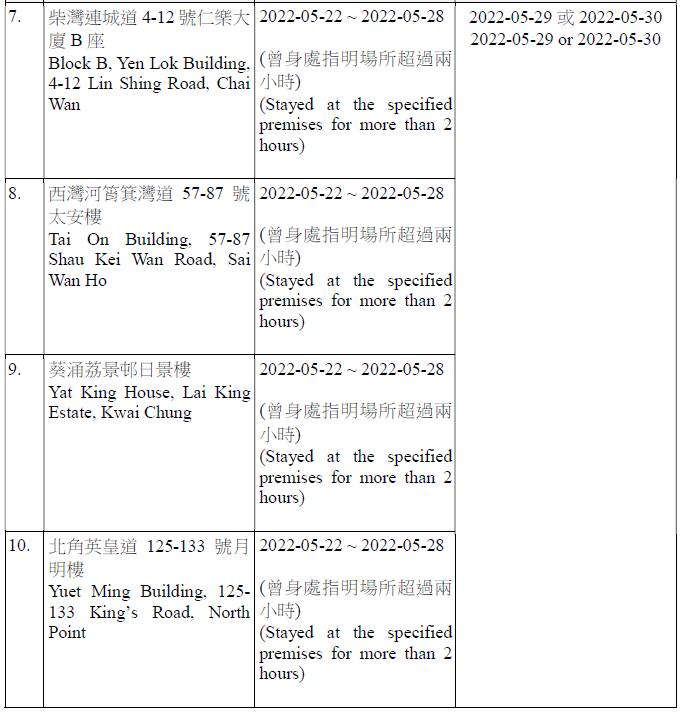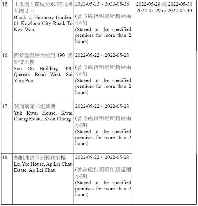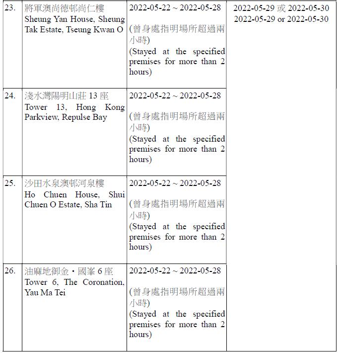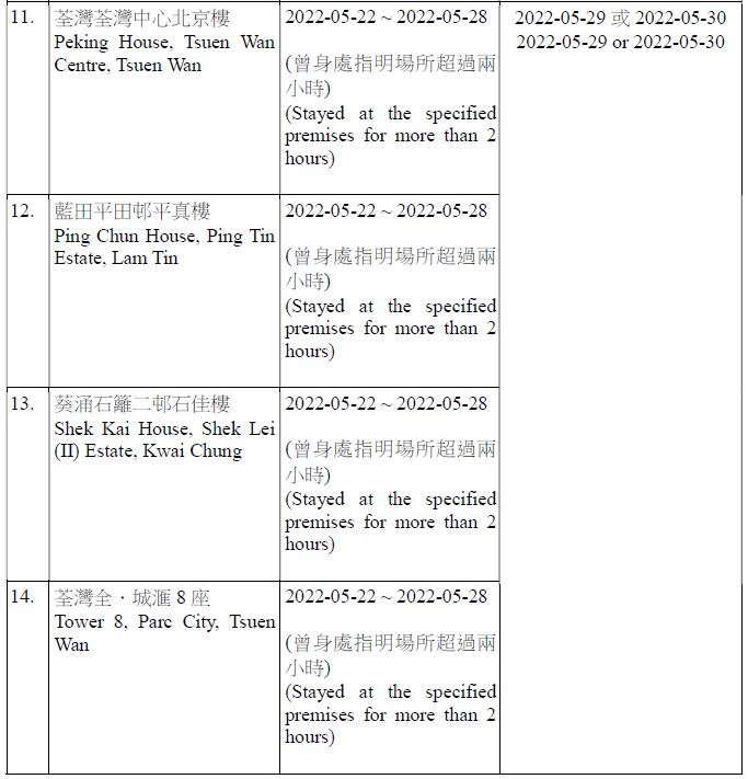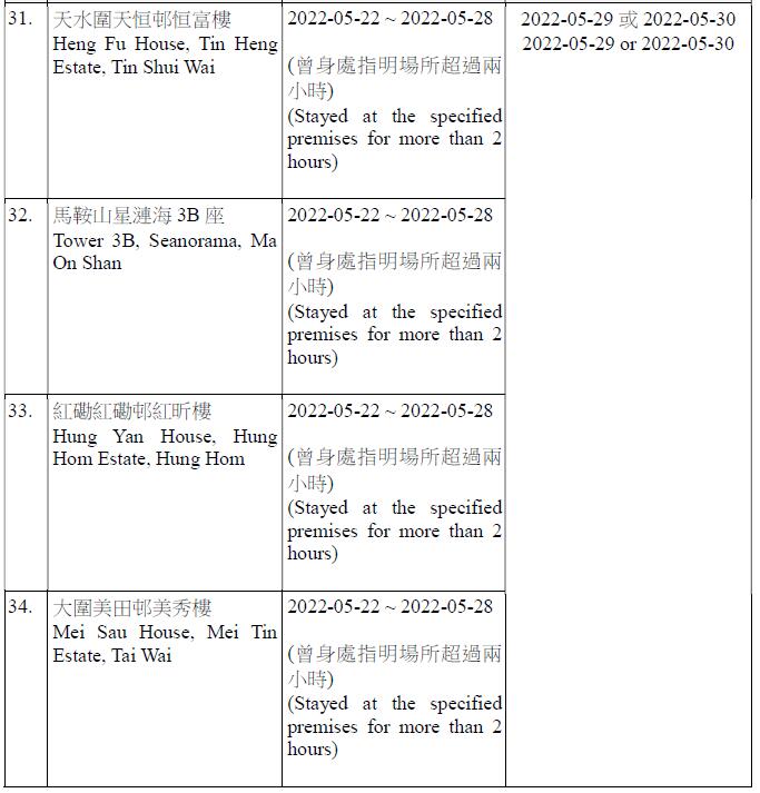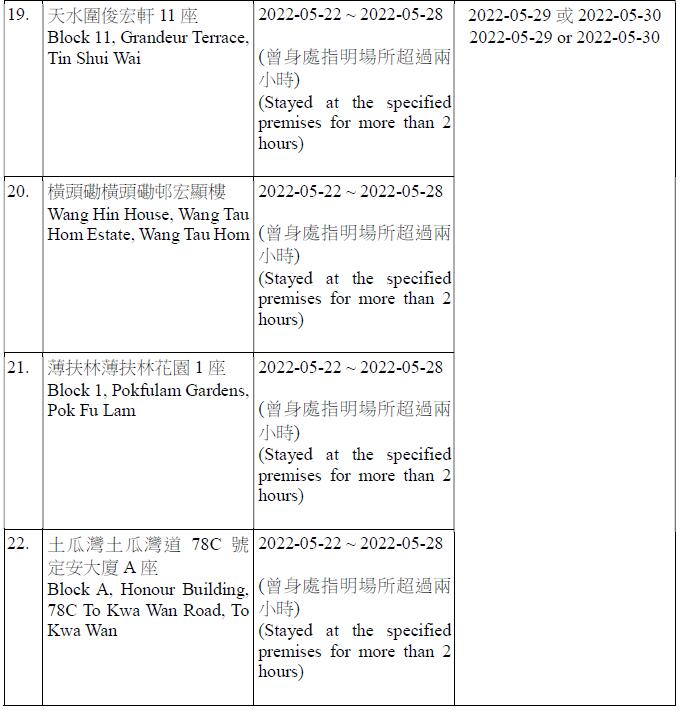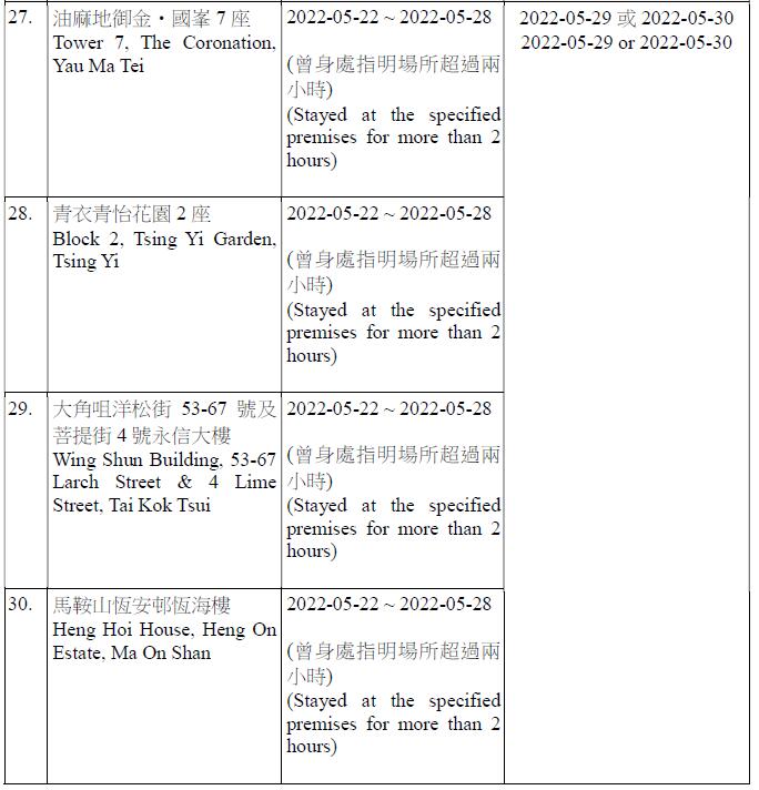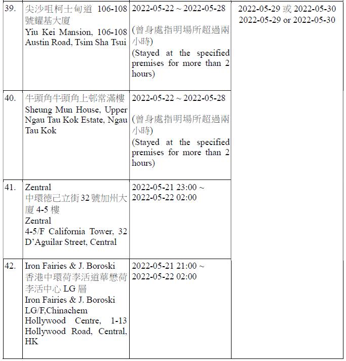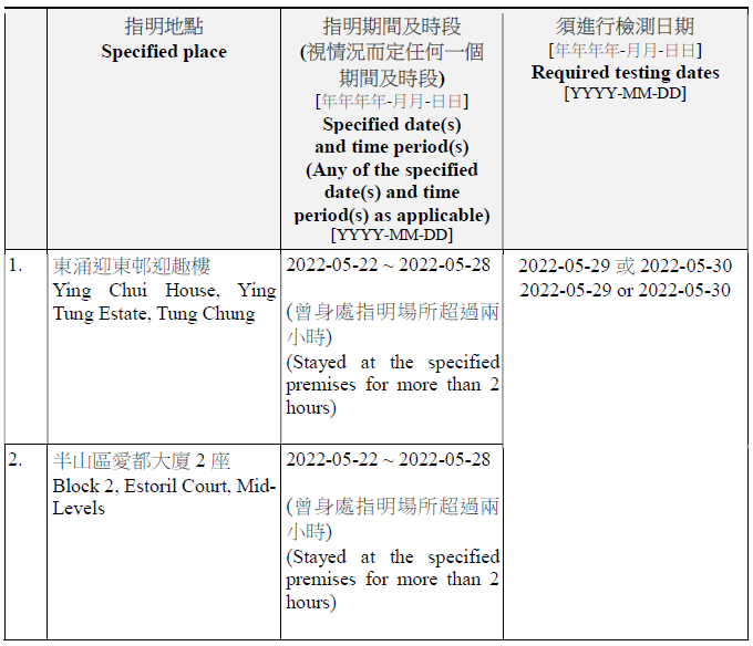 因應多宗陽性檢測個案,港府今晚(28日)就強制檢測公告刊憲,要求於指定期間曾身處42個指明地方的人士,接受核酸檢測,包括東涌迎東邨迎趣樓、半山區愛都大廈2座、何文田亞皆老街100號皆寧大廈、元朗Grand Yoho 1座、又一村又一居11座、上水上水中心5座、柴灣連城道4-12號仁樂大廈B座、西灣河筲箕灣道57-87號太安樓、葵涌荔景邨日景樓及北角英皇道125-133號月明樓等。