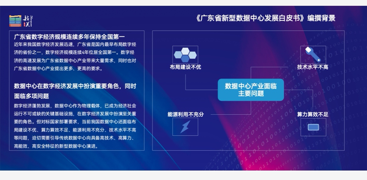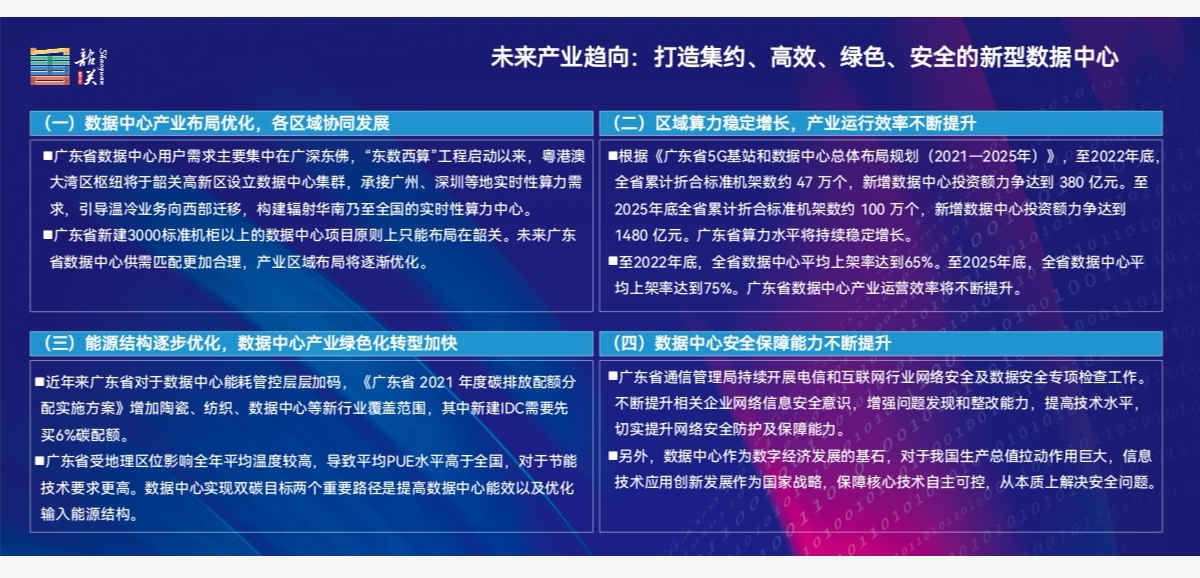 數據資源存儲、計算和應用需求大幅提升,數據中心是各個行業信息系統運行的物理載體,是推動數字經濟發展的關鍵基礎設施。加快新型數據中心布局,能更好提供算力支持,支撐廣東省新一代信息技術加速創新,推動粵港澳大灣區樞紐建設,推進經濟社會的數碼化轉型進程。