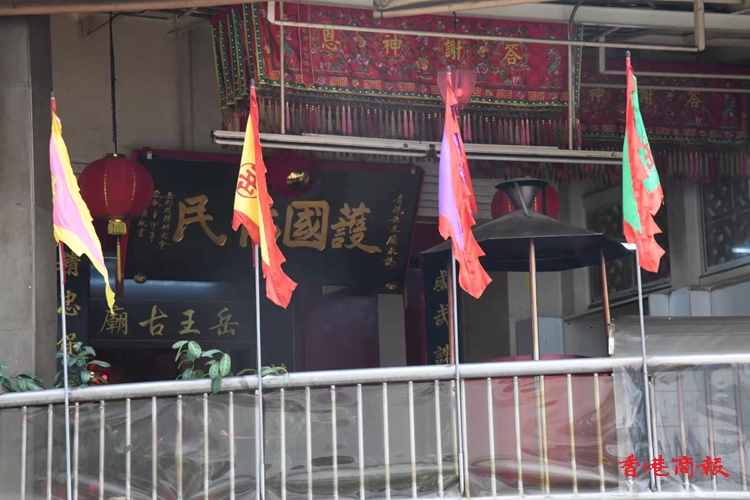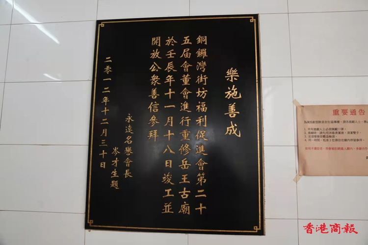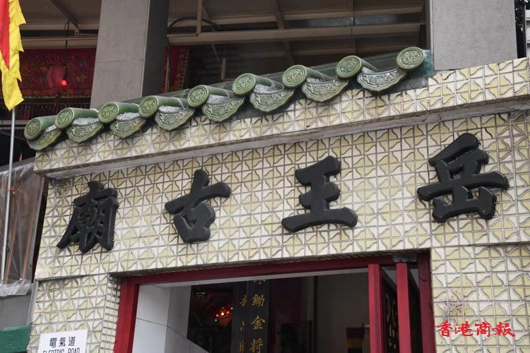 岳王古廟創建於30年代,位於銅鑼灣電氣道,是為紀念宋朝民族英雄岳飛而興建的。該古廟原位於一高台之上,旁邊建有一座巨型化寶爐,而廟前設有一段小石級,令參拜的善信要拾級而上,才能到達高台之上。戰後廟宇在外圍加建了一道圍牆,大門口則採用石屎皮加上現代化的鐵閘。廟的內部平台頂上,全用鐵皮鐵架搭建而成,並設有窗門,把整個平台變為一間像室內廳房的格局,表面看上去仿似西式的庭園,沒有普通古廟的中式紅牆綠瓦的建築。廟的中央為奉祀岳飛的神靈,左右為關帝及觀音的神位,一到假日便有大量市民前來參拜。(蔡啟文攝)