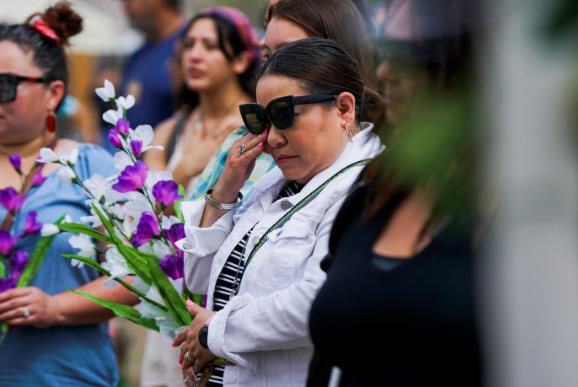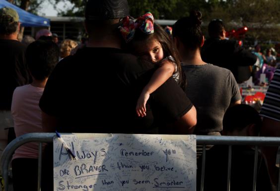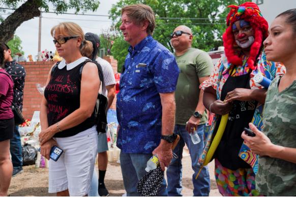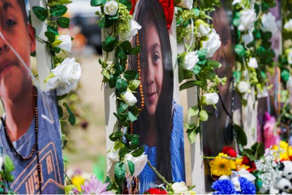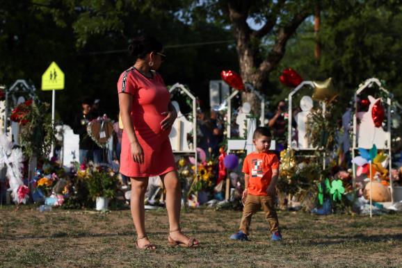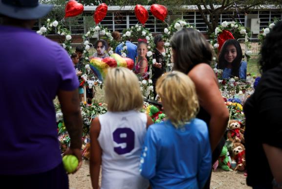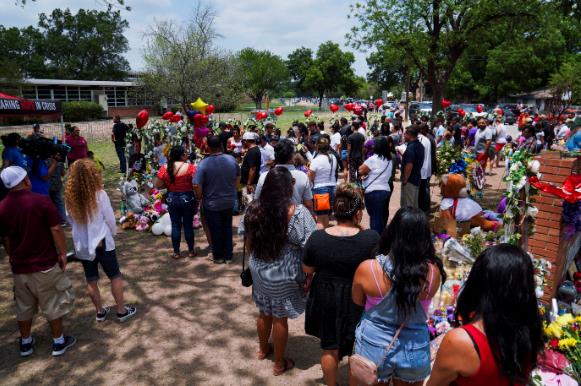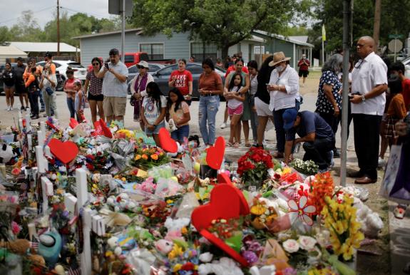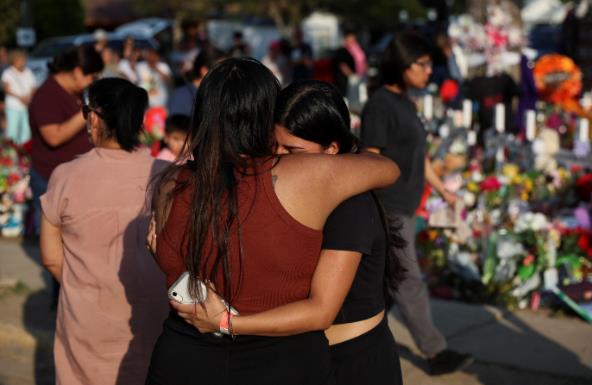 當地時間30日,在美國得克薩斯州南部尤瓦爾迪市(Uvalde),人們哀悼槍擊事件遇害者。該市5月24日發生惡性校園槍擊事件,造成至少19名兒童和2名教師死亡。這是美國近十年來遇害人數最多的一起校園槍擊事件。(圖源:路透社)