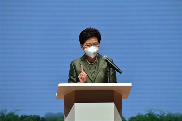 林鄭月娥致辭時表示,博物館的落成全賴各個團隊上下一心、努力拼搏,即使受到過去兩年多疫情影響,香港故宮項目不單沒有超支或延誤,馬會就項目慈善捐獻更餘下約2.6億元,將撥作香港故宮日後的營運經費,特別投放在展覽及教育活動上。她稱,香港故宮的落成,剛好處於香港文化發展的關鍵時刻。去年3月頒布的國家「十四五」規劃綱要首次明確支持香港發展成為中外文化藝術交流中心,香港故宮將以香港所長,服務國家所需,積極與國際文化機構進行交流和合作,將中華優秀傳統文化向世界傳播,並以文明互鑑,增進國際友誼,展示中國文化建設的成就。