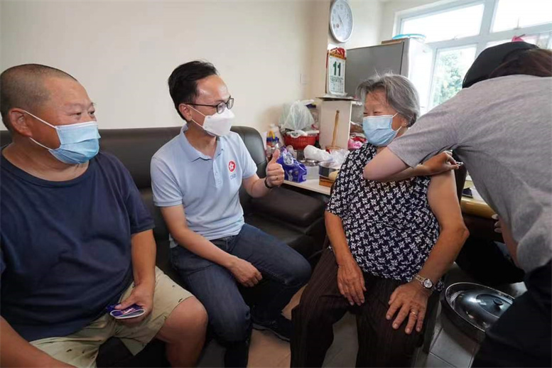 頂圖:聶德權在坪洲與一位剛接種新冠疫苗的長者一同支持「疫苗到戶接種服務」。(政府新聞處)