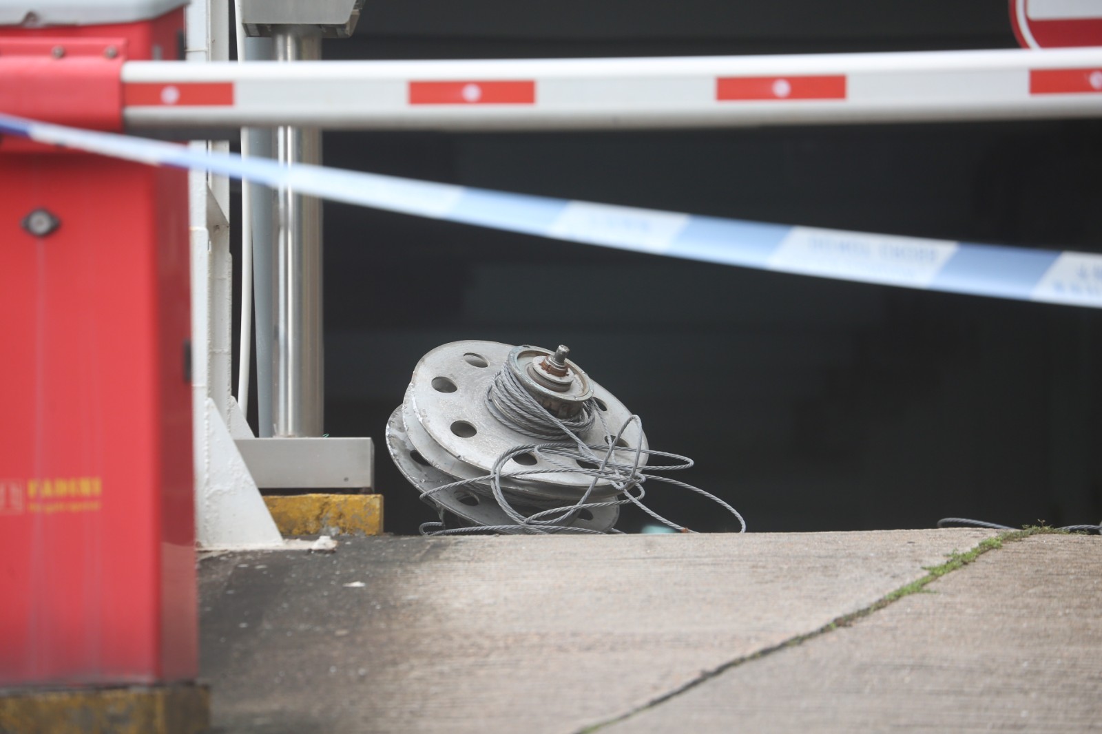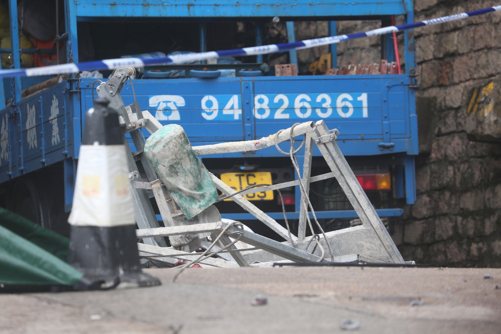 現場所見,吊船墮落在一輛私家車旁,零件及鋼纜四散,地上遺下大灘血漬。而涉事的鋼纜斷裂,固定吊船的支架扭曲變形,未知是否墮下時導致。
