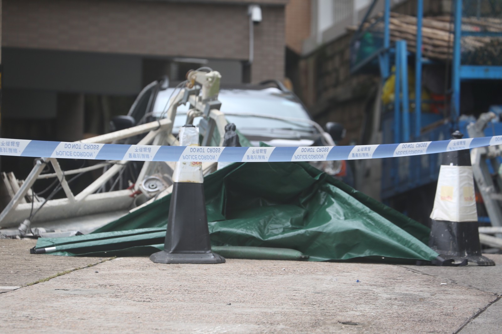 警方用帳蓬將2名工人遺體遮蓋,涉事吊船嚴重損毀。