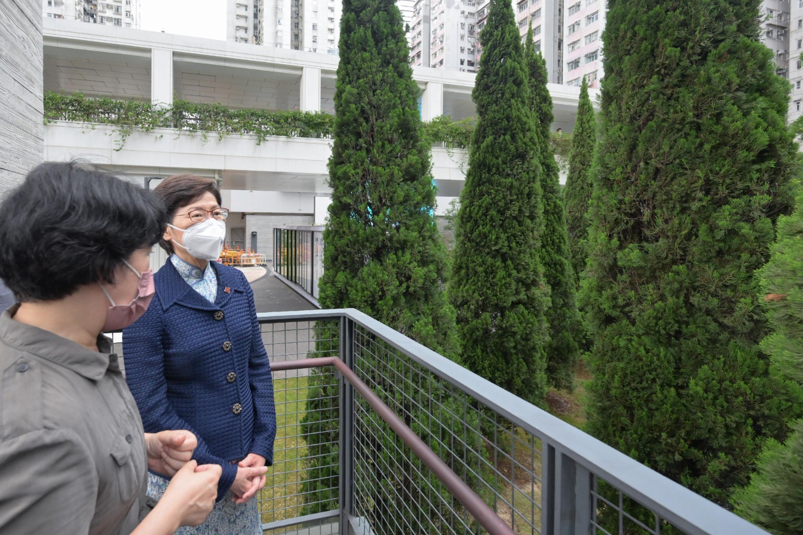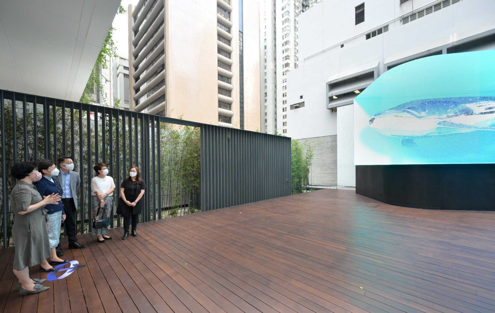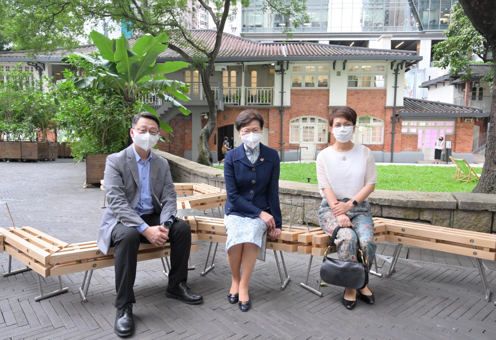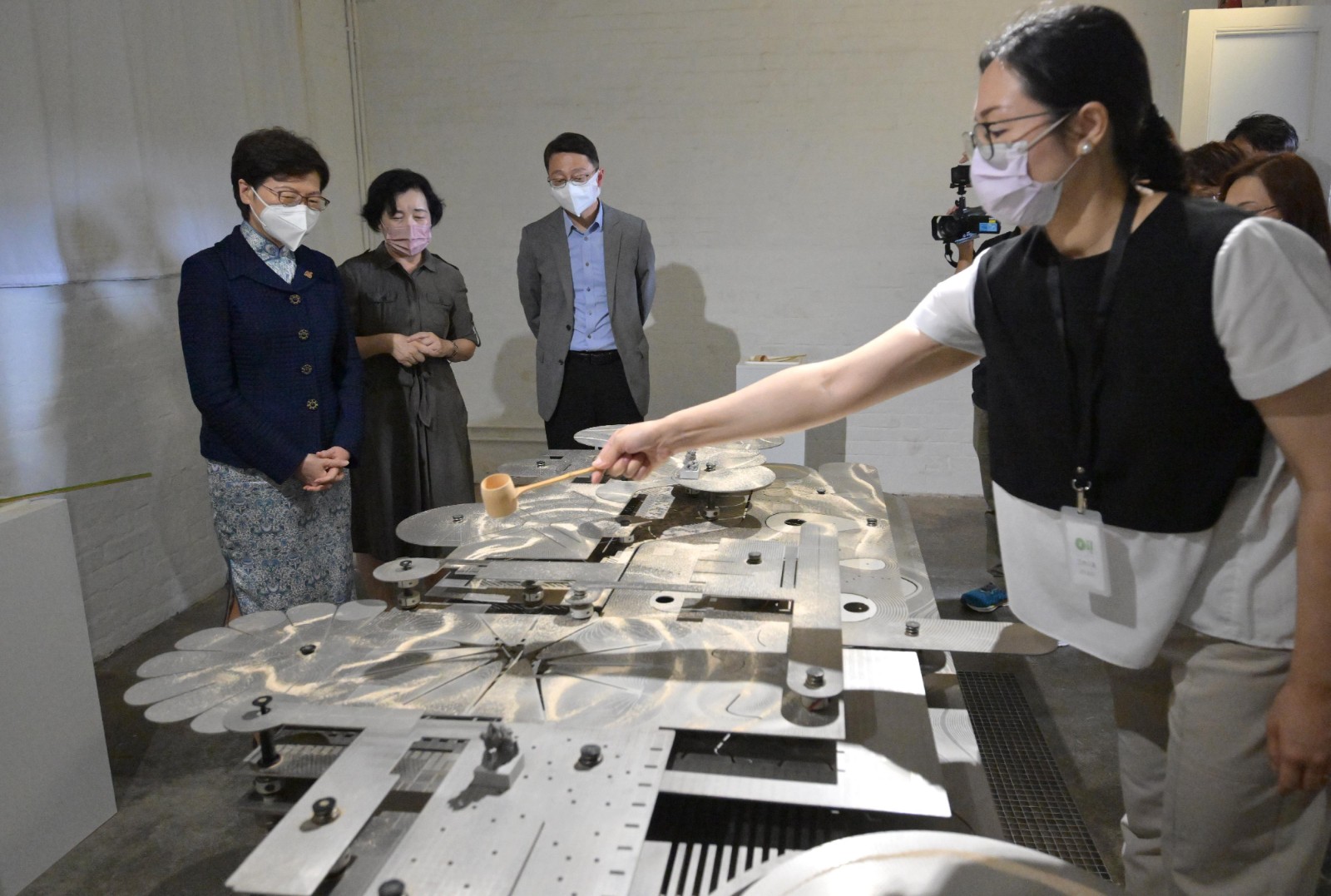 林鄭月娥在康樂及文化事務署署長劉明光陪同下,參觀油街實現內不同項目,包括2個慶祝香港特別行政區成立25周年的展覽,分別是由多棵龍柏樹組成的「賞森.悅木」和結合藝術與科技以展示翻騰巨浪和藍鯨暢泳的「新域混影」,亦聽取油街實現自2019年起進行擴展計劃的介紹及5月下旬開放後的運作情況。