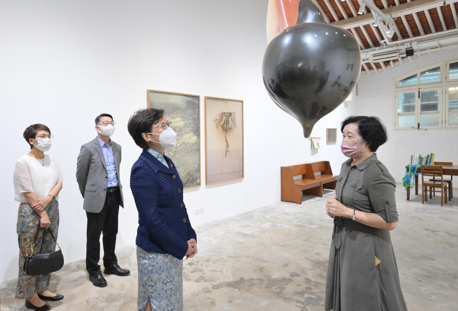 行政長官林鄭月娥今日(六月十三日)到訪擴展後啓用的北角油街實現藝術空間,觀賞該處的藝術項目及其新面貌,包括2個為慶祝香港特區成立25周年的展覽。林鄭表示,希望本港不同地區可打造各具特色的文化藝術地標,充分發揮香港中西薈萃、古今交融的獨特魅力。