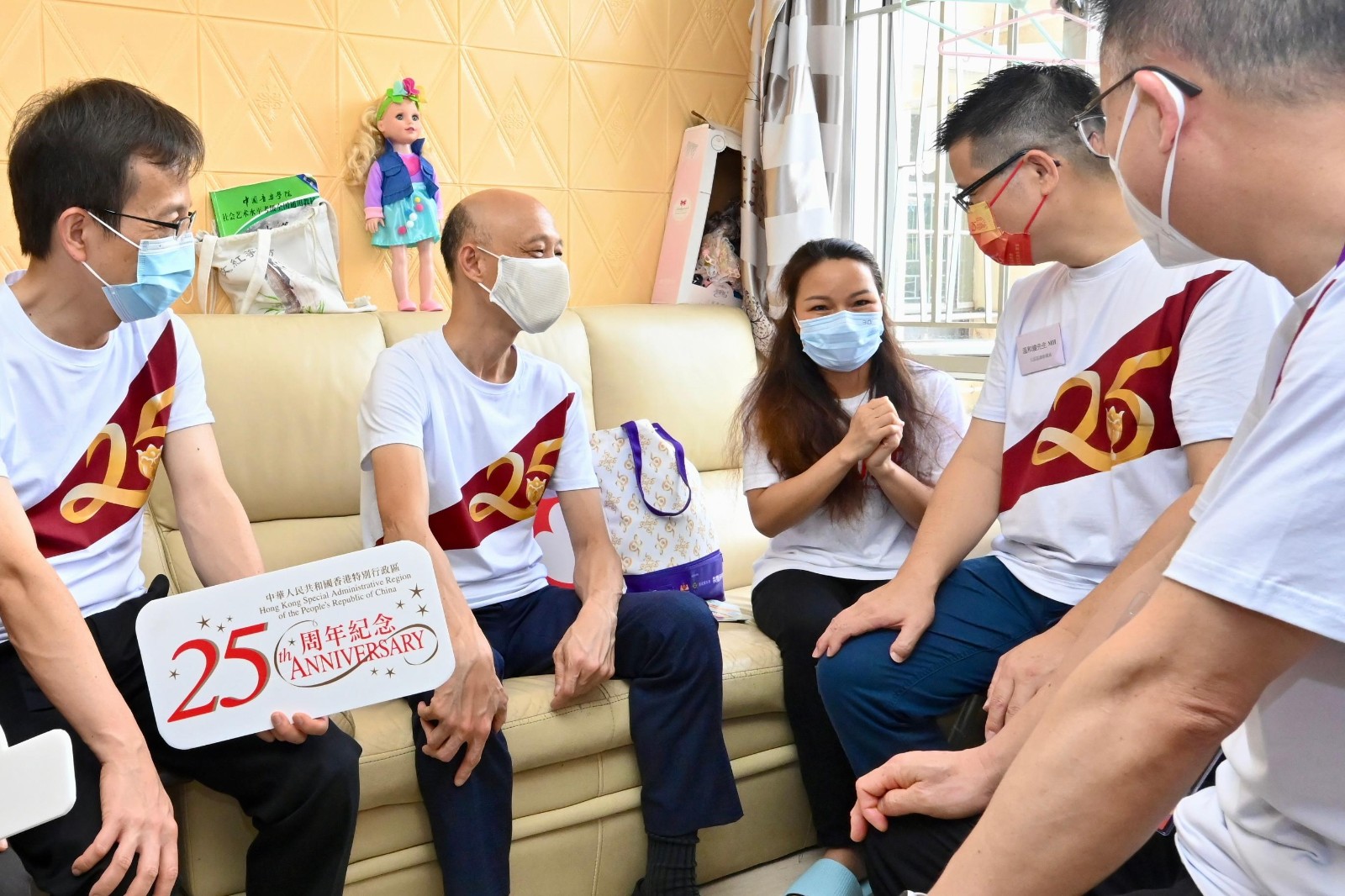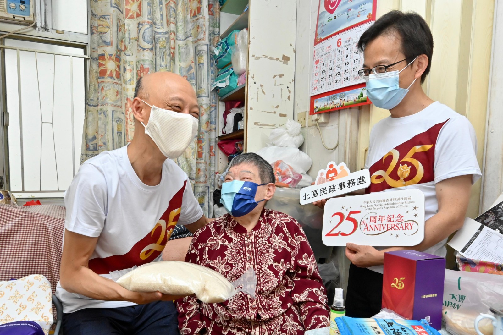 黃錦星在北區民政事務專員莊永桓陪同下,與北區區議員、地區和社福機構的代表和義工團隊探訪粉嶺嘉福邨一名獨居長者及兩個基層家庭,關心他們的生活情況和需要,並向他們派發25周年慶祝活動禮物包,共慶回歸。