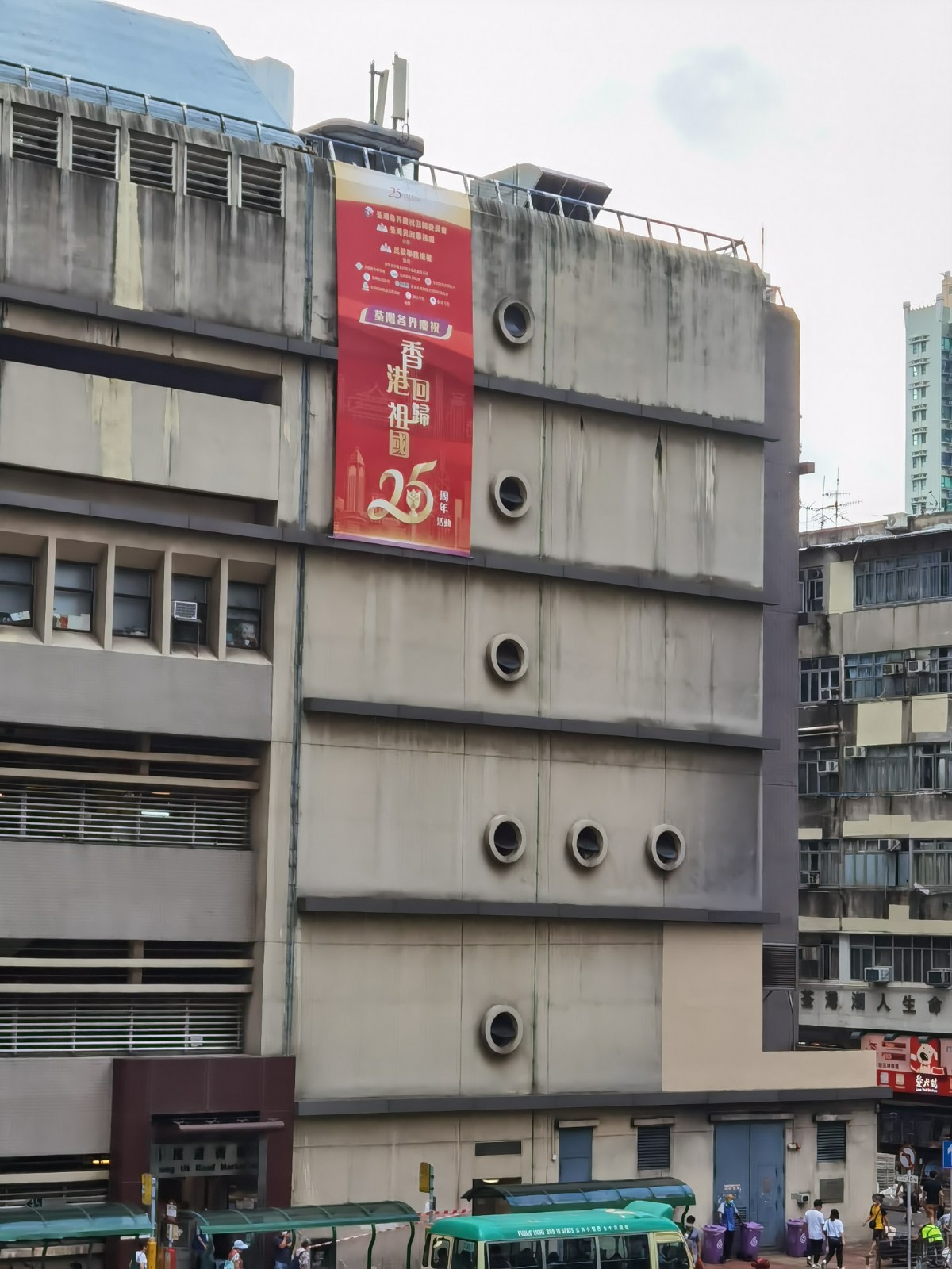 在城區中心的楊屋道街市和街市街街市,幾幅巨型的彩繪舒展,吸引了往來行人目光;在通往荃灣地鐵站的行人天橋上,幾乎每根柱子都被慶祝海報包裹;而在雅麗珊社區中心的外牆上,更是懸掛了一副達60平方米的巨型慶祝海報,於天橋上一覽無餘,成為市民拍照的最好背景。市民Cat和Aimee開心地以海報長廊為背景合影,照片在臉書和微信朋友圈都收穫了不少點讃。