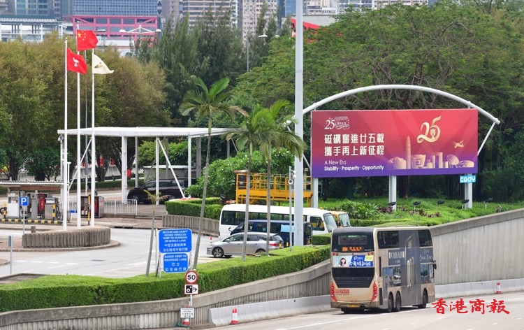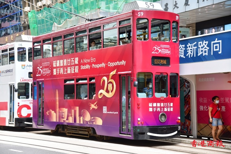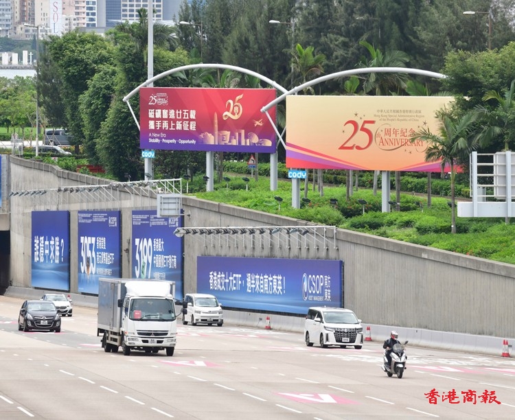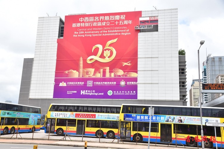 在香港,慶回歸25周年的各項裝飾工作已經進行得如火如荼,其中在港九多處,各界熱烈祝賀的巨型廣告橫額,分別展現於海底隧道出入口或各主要建築物當眼之處,而公共交通工具例如電車,也換上慶回慶的「新衣」。