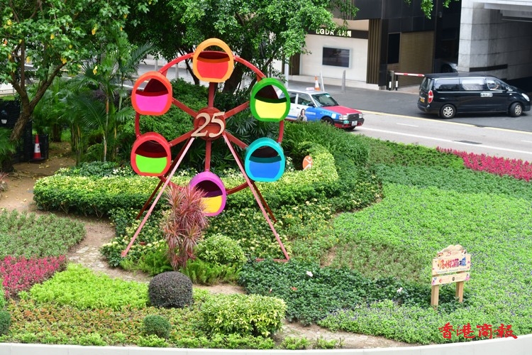 此外,康文署從6月起至10月分階段推展「花悅滿城」計劃,在中區畢打街迴旋處及金鐘一帶,以花花草草粉飾了多個主題園圃,洋溢著一片歡樂、詳和的氣氛。(攝影:崔俊良)