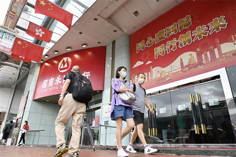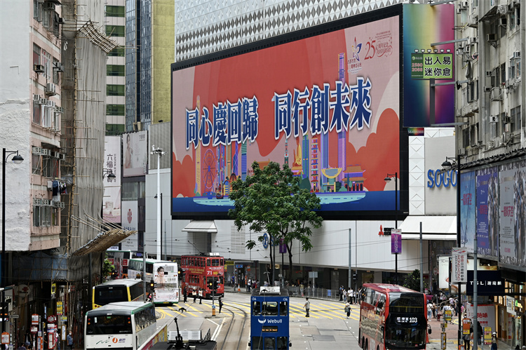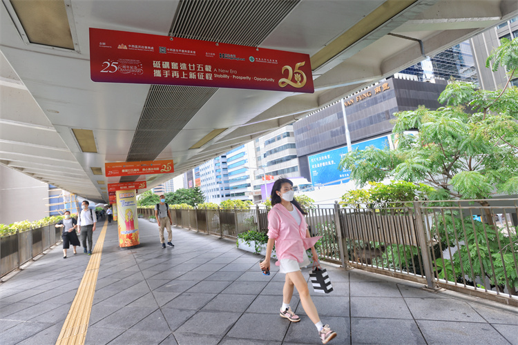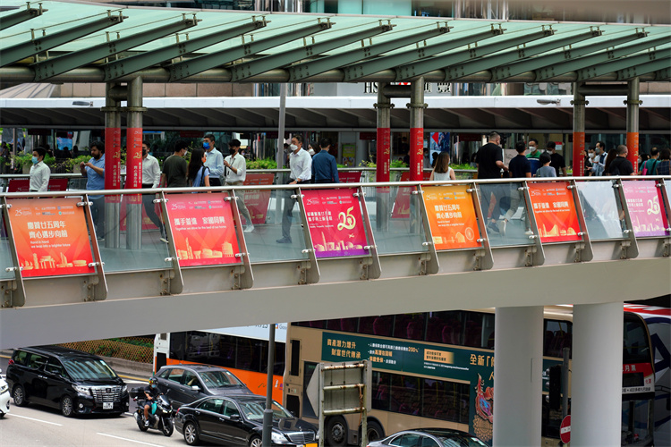 隨着香港回歸25周年紀念日的臨近,香港街頭喜慶氣氛漸濃,人們可以感受到喜慶氛圍。香港各區掛出了祝賀標語,維港兩岸部分標誌性大廈的戶外大屏幕也在循環播放慶回歸視頻和展示慶祝燈飾。