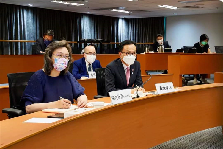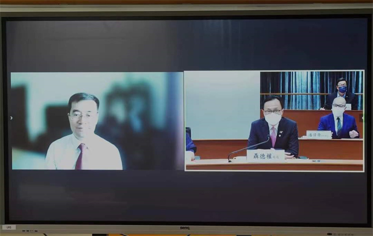 公務員事務局局長聶德權(左)與高飛於視像講座交流,旁為公務員事務局常任秘書長楊何蓓茵(右)。