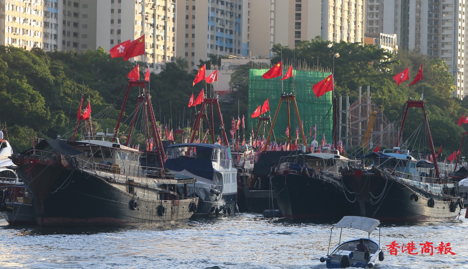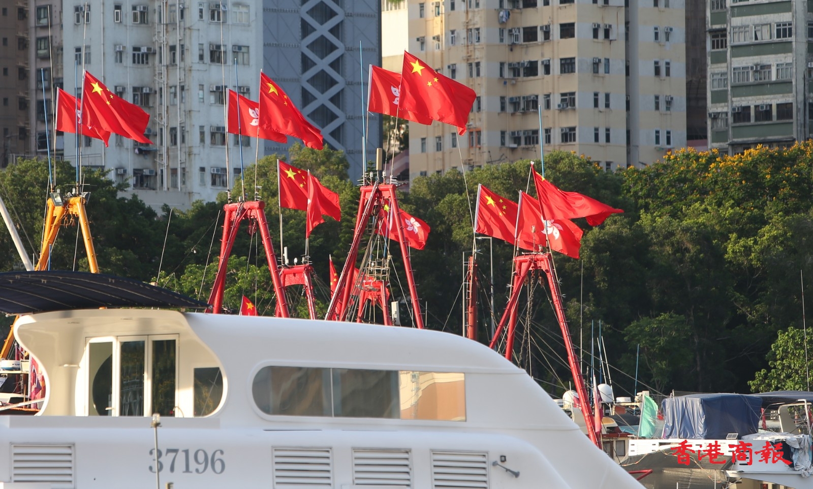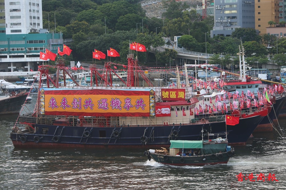 為慶祝香港回歸祖國25周年,香港仔避風塘多艘漁船都掛上國旗區旗,旗海飄揚下,充滿喜慶氣氛。當中有漁船掛起大型花牌,寫上「同心慶回歸 同行創新篇」的祝賀標語,極為吸睛。