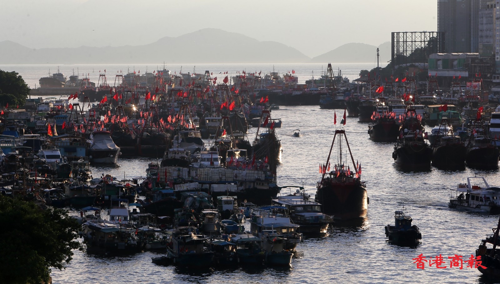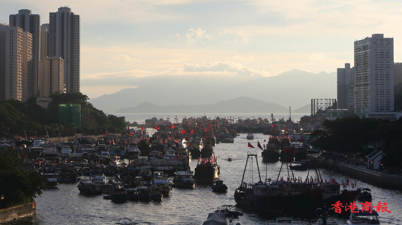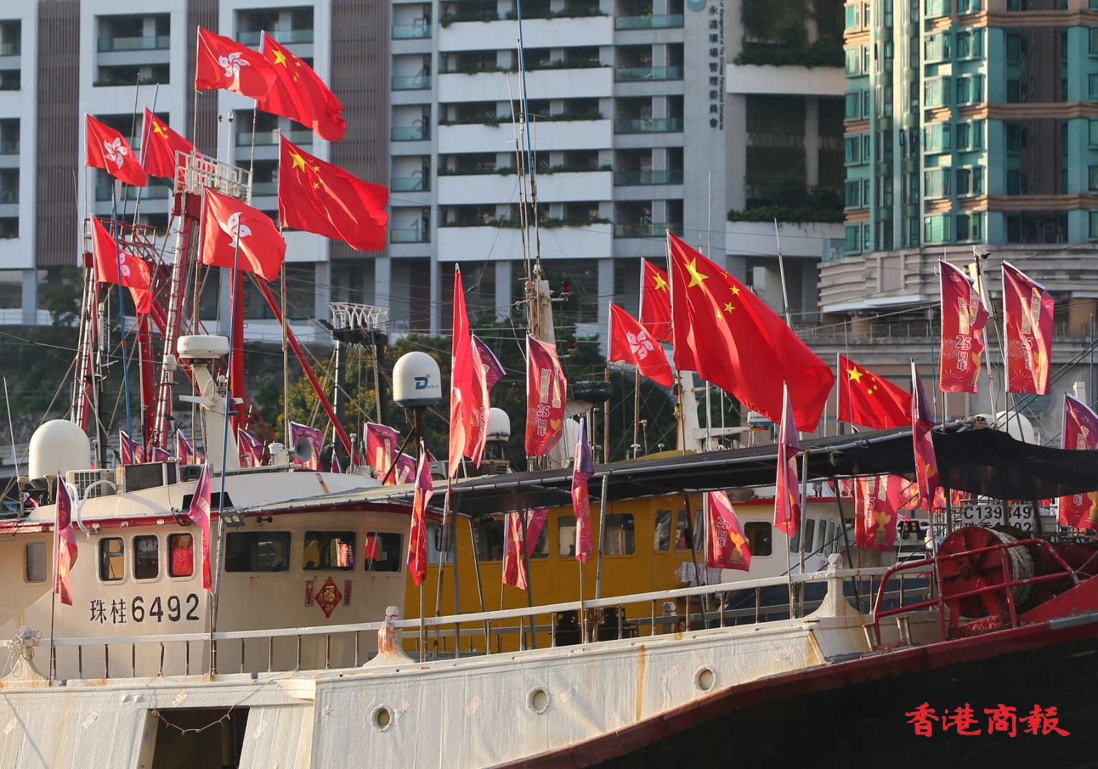 為慶祝香港回歸祖國25周年,香港仔避風塘多艘漁船都掛上國旗區旗,旗海飄揚下,充滿喜慶氣氛。當中有漁船掛起大型花牌,寫上「同心慶回歸 同行創新篇」的祝賀標語,極為吸睛。