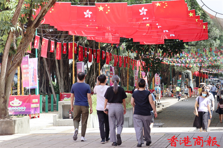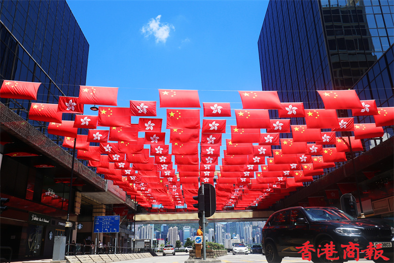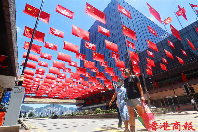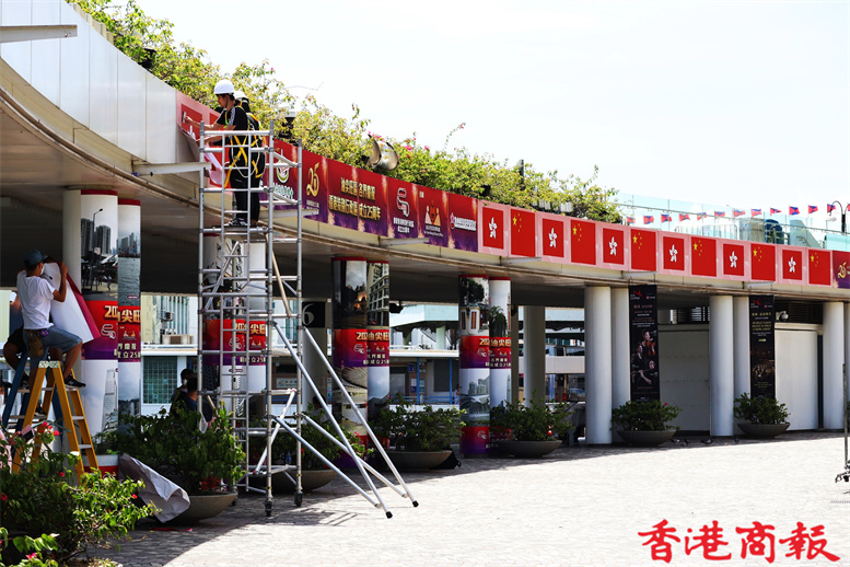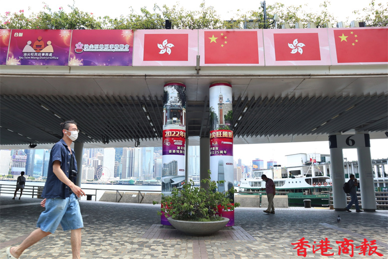 距離香港回歸祖國25周年還有數天,香港街頭喜慶氣氛也越來越熾熱。在尖沙咀碼頭、尖東及柏麗大道正密鑼緊鼓布置,逾百面國旗及區旗掛滿街頭,香港市民行過路中,抬眼便可見到一片鮮艷「旗海」,十分壯觀。(記者馮瀚文 攝)