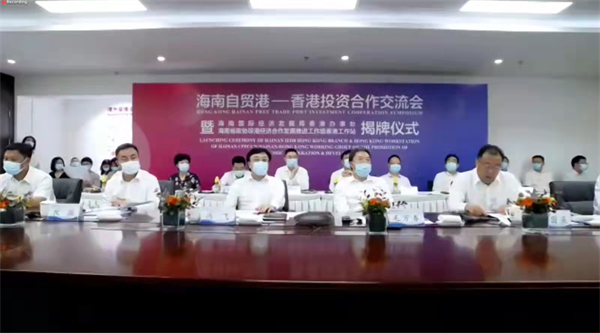 由瓊港經濟合作發展諮詢委員會及海南國際經濟發展局主辦的「海南自貿港-香港投資合作交流會」,暨海南國際經濟發展局香港辦事處、海南省政協瓊港經濟合作發展推進工作組香港工作站揭牌儀式,今日(27日)在海南及香港兩地以線上方式進行。全國政協副主席梁振英、海南省省長馮飛、海南省政協主席毛萬春、海南省副省長倪強、海南省政協副主席李國梁、瓊港經濟合作發展諮詢委員會主任委員岳毅、瓊港經濟合作發展諮詢委員會副主任委員蘇錦樑、海南國際經濟發展局顧問、駐香港辦事處首席代表葉澤恩等,以及約400位香港本地及外國企業商會代表參會。