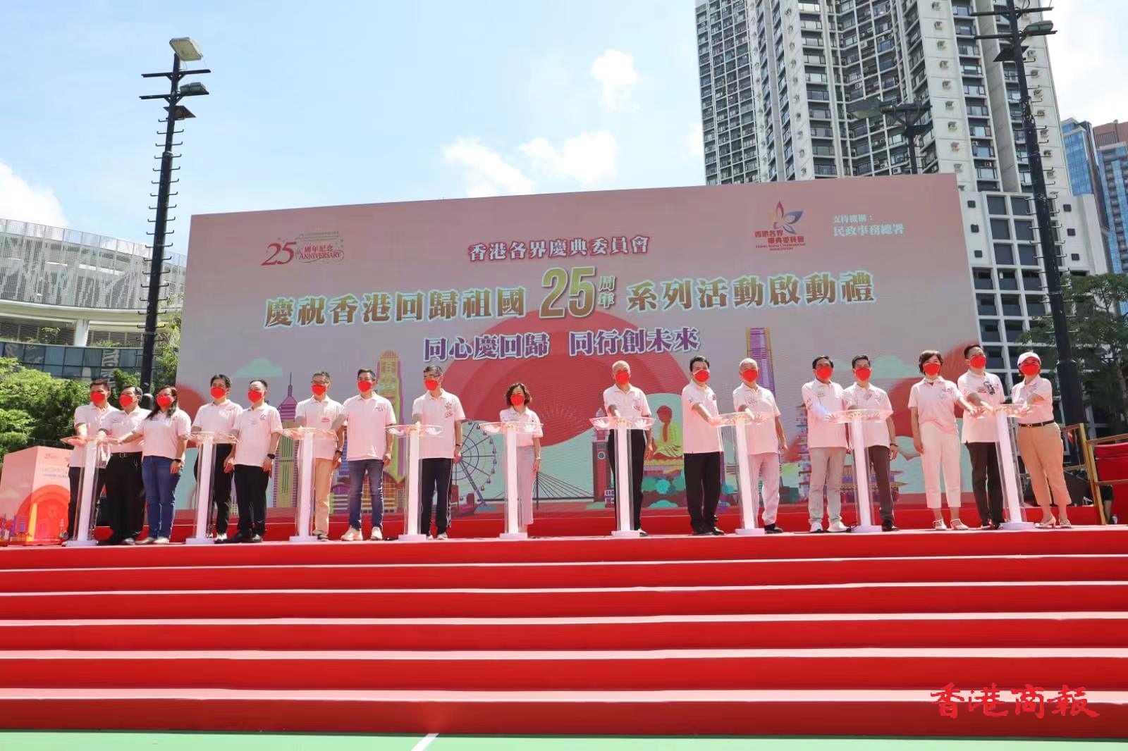 由香港各界慶典委員會主辦的「慶祝香港回歸祖國25周年」系列活動,今日(28日)於維多利亞公園舉行啟動禮,出席的主禮嘉賓包括民政事務總署署長張趙凱渝、中聯辦社會工作部副部長張昭、九龍工作部副部長祝小東、新界工作部副部長李功勳、港島工作部社工處處長溫汝恩,以及香港各界慶典委員會籌委會會長陳鴻道等。