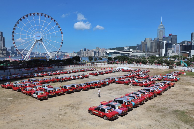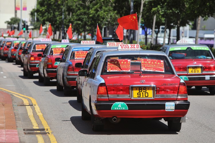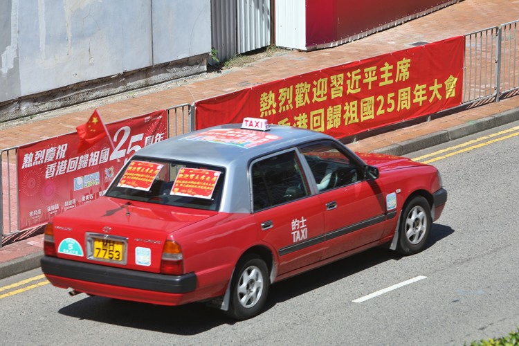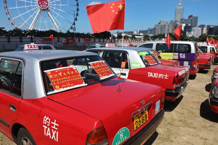 香港的士司機從業員總會今天(28日)舉行「開新篇、創未來 慶祝香港回歸25周年系列的士巡遊」活動,逾100架的士掛國旗、貼海報,在中環海濱空地擺出「25」字樣,慶祝香港回歸祖國25周年。