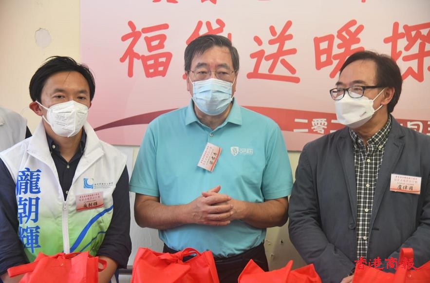 港區省級政協委員聯誼會、經民聯、一帶一路總商會、香港陝西社團聯合總會和香港北京交流協進會今日(3日)共同舉辦「慶香港回歸祖國25周年福袋送暖探訪行動」,立法會主席梁君彥、經民聯主席盧偉國、經民聯深水埗地區成員黃永威與龐朝輝、港區省級政協委員聯誼會主席鄭翔玲和聯誼會會長施榮懷出席了致贈儀式。