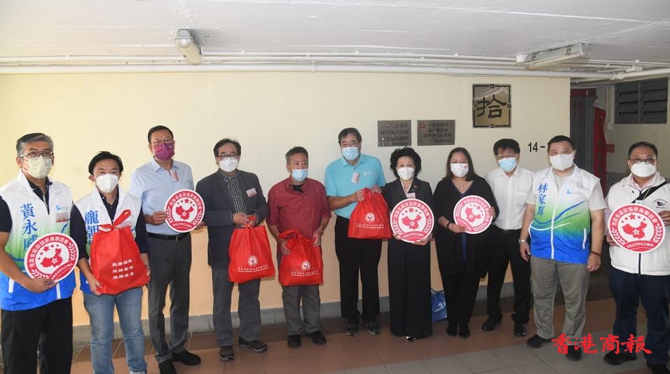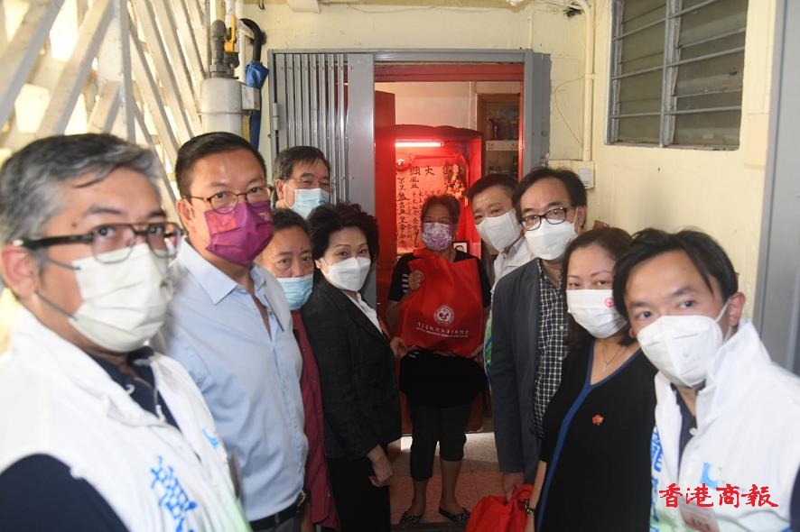 港區省級政協委員聯誼會主席鄭翔玲、會長施榮懷、經民聯主席盧偉國、立法會主席梁君彥、深水埗地區成員黃永威與龐朝輝上門向居民贈送福袋。