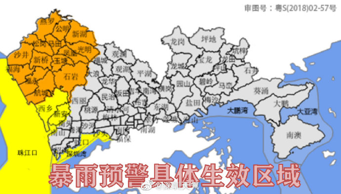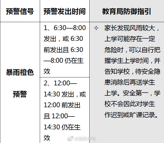 據深圳天氣微博消息,目前深圳市分區暴雨橙色預警+分區暴雨黃色預警+分區雷雨大風黃色預警生效中。根據深圳市教育局印發的《颱風暴雨高級別預警分時段學校防禦指引》(2017年修訂版)規定:暴雨橙色預警在今日(4日)6:30-8:00發布或生效時,學生家長發現風雨較大,上學可能存在一定危險時,可自行把握學生上學時間,並告知學校,待安全隱患消除後再送學生上學。安全第一,學校不會因此對學生作遲到或曠課記錄。請朋友們注意防雨、防風、防雷,外出時避開低窪、積水地帶,避免觸碰帶電物品,安全第一。