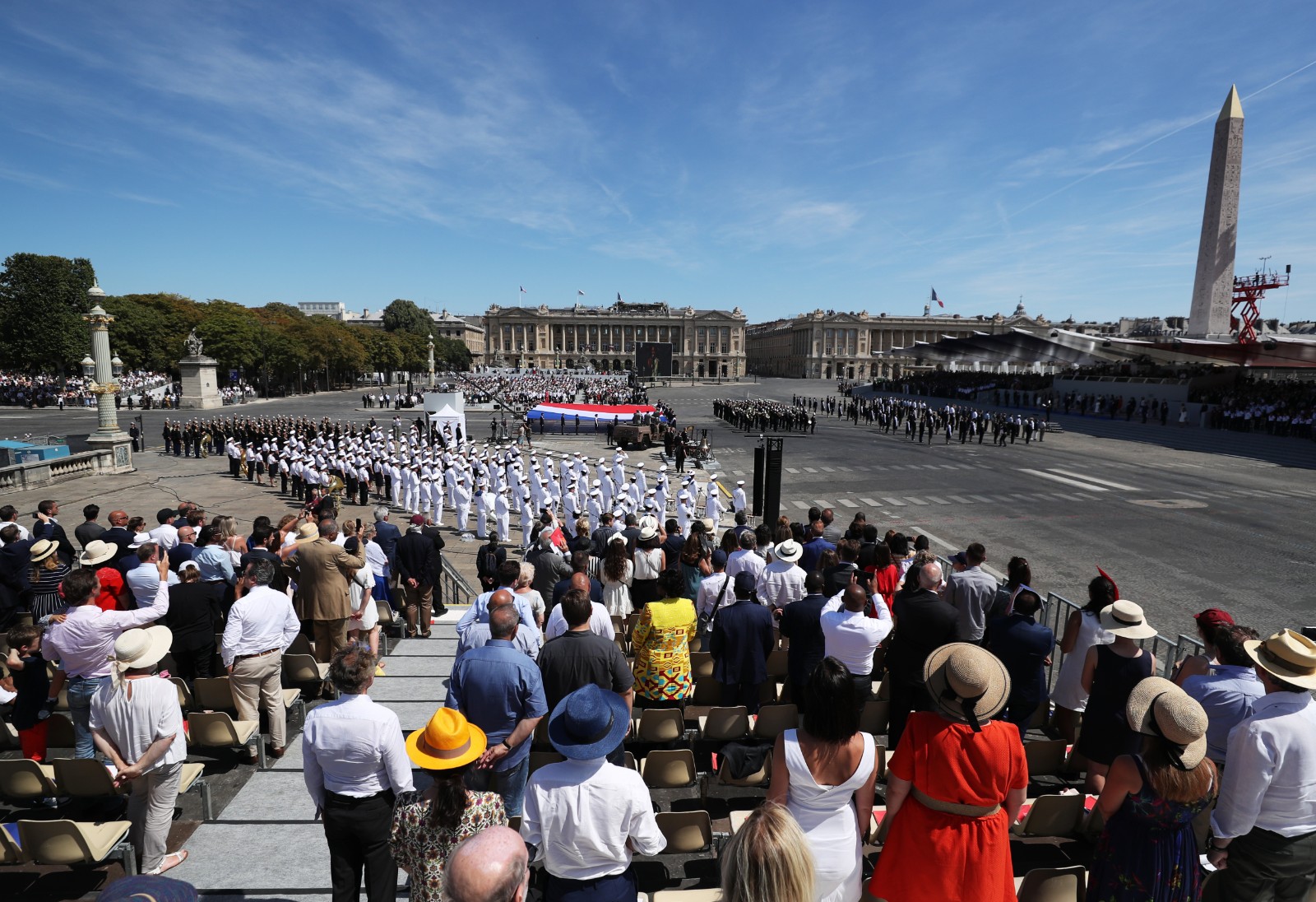 為迎接2024年巴黎奧運會,在閱兵式的最後階段,9名在奧運會和殘奧會上獲得獎牌的法國運動員佩戴獎牌出現在協和廣場上,面向主席台與現場其他人員一起高唱法國國歌《馬賽曲》。(圖源:新華社)