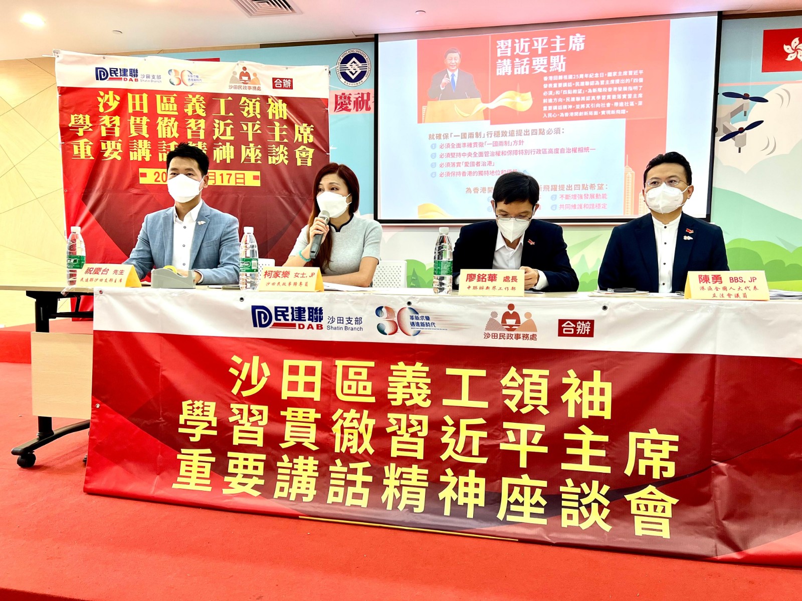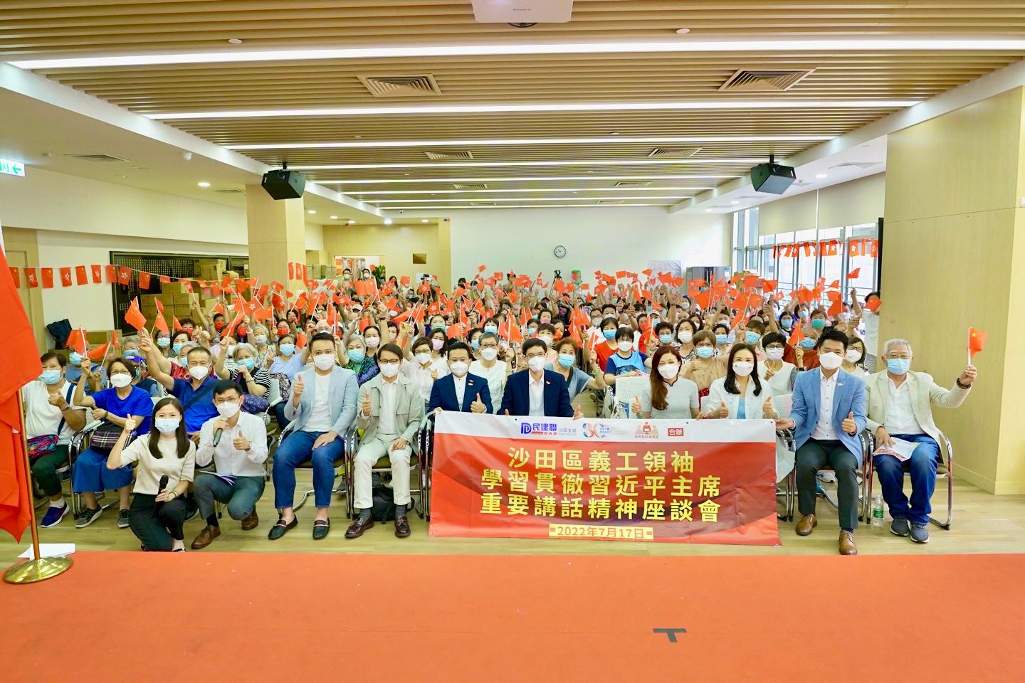 沙田民政事務處則繼在7月8日及14日舉行三場座談會後,昨日再聯同民建聯沙田支部,在沙田合辦「沙田區義工領袖學習貫徹習近平主席重要講話精神座談會」,邀請港區全國人民代表大會(全國人大)代表兼立法會議員陳勇作主講嘉賓。中聯辦新界工作部處長廖銘華、沙田民政事務專員柯家樂及民建聯沙田支部主席祝慶台亦有發言。約200人出席座談會,與會者包括沙田區的地區人士及義工。