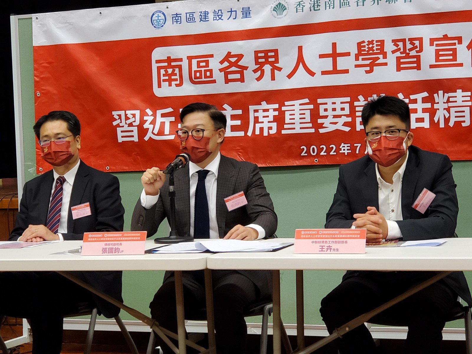 南區民政事務處今日(18日)聯同香港南區各界聯會及南區建設力量,在華貴社區會堂合辦「學習宣傳貫徹習近平主席重要講話精神座談會」,邀請律政司副司長張國鈞為主講嘉賓。中聯辦港島工作部副部長王卉、南區民政事務專員鄭港涌、立法會議員陳學鋒、陳家珮及陸瀚民亦先後在會上發言。約200多人出席座談會,與會者包括地區領袖、南區撲滅罪行委員會、南區防火委員會、南區各分區委員會、南區青年活動委員會以及南區學校聯會委員、政府部門代表及南區民政事務處職員。