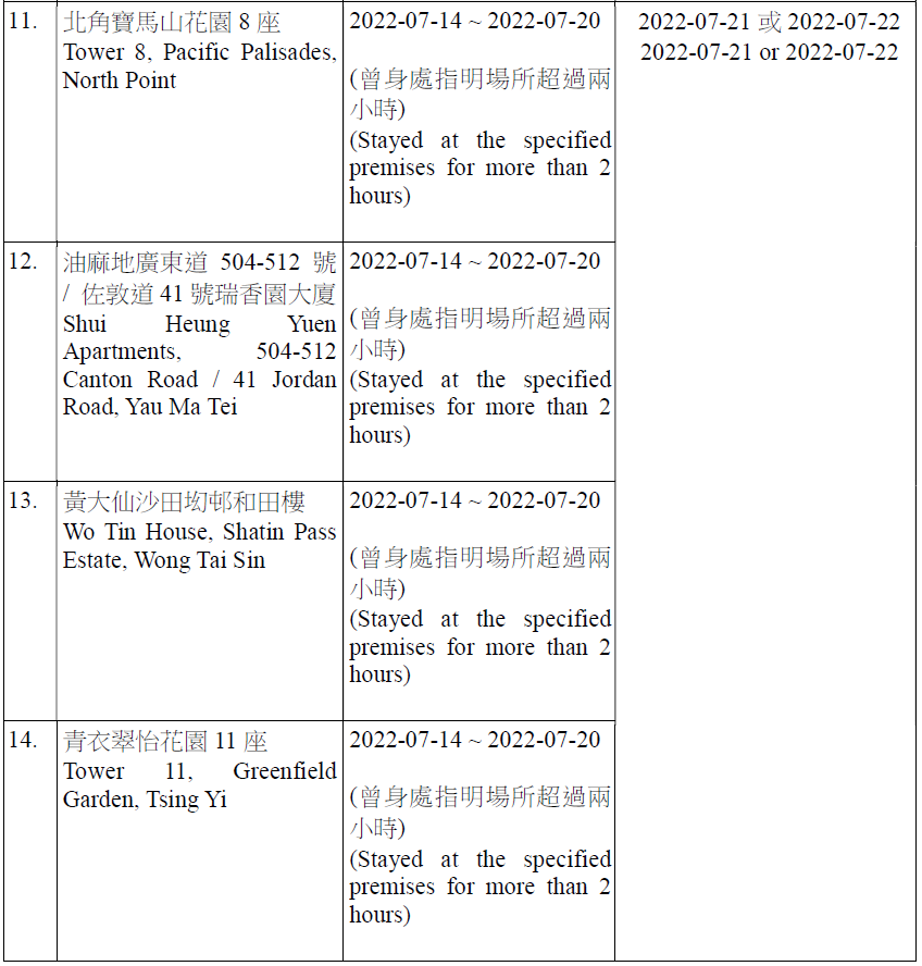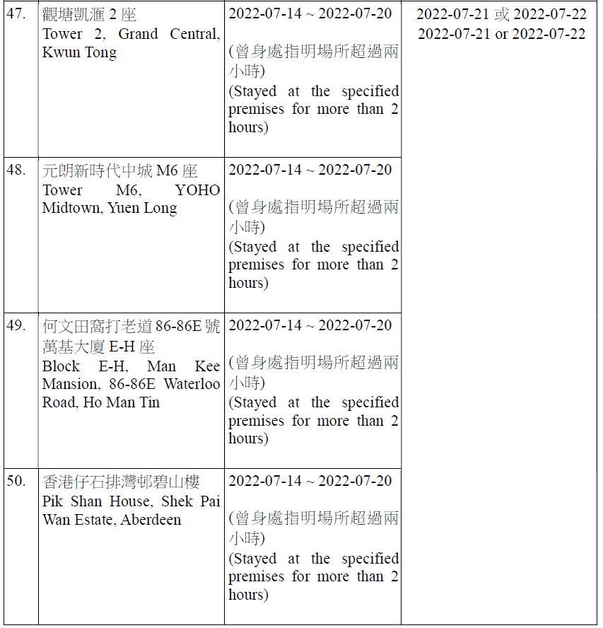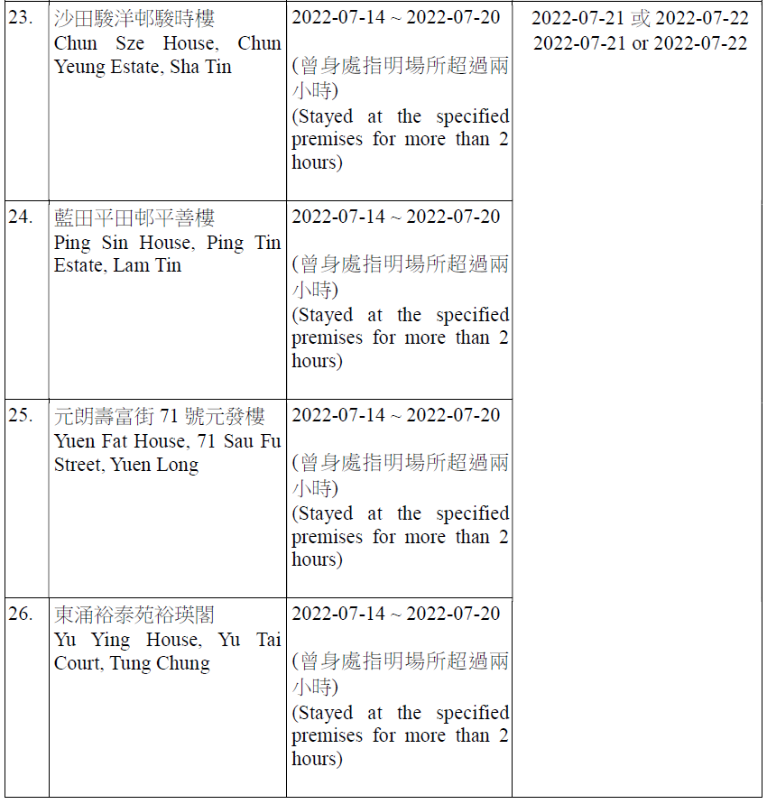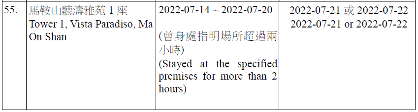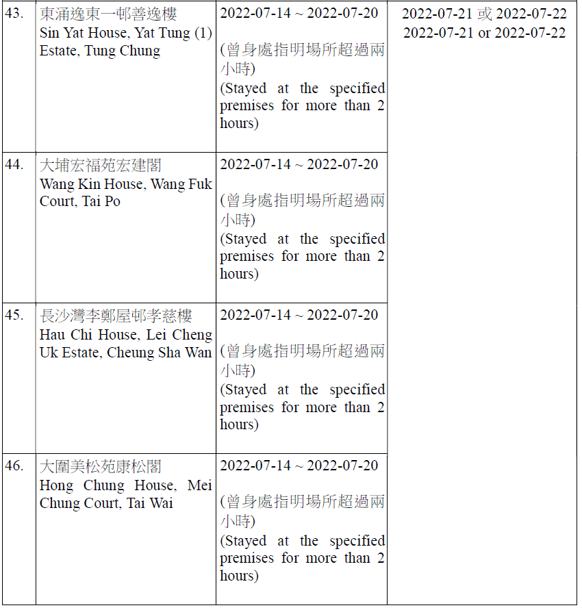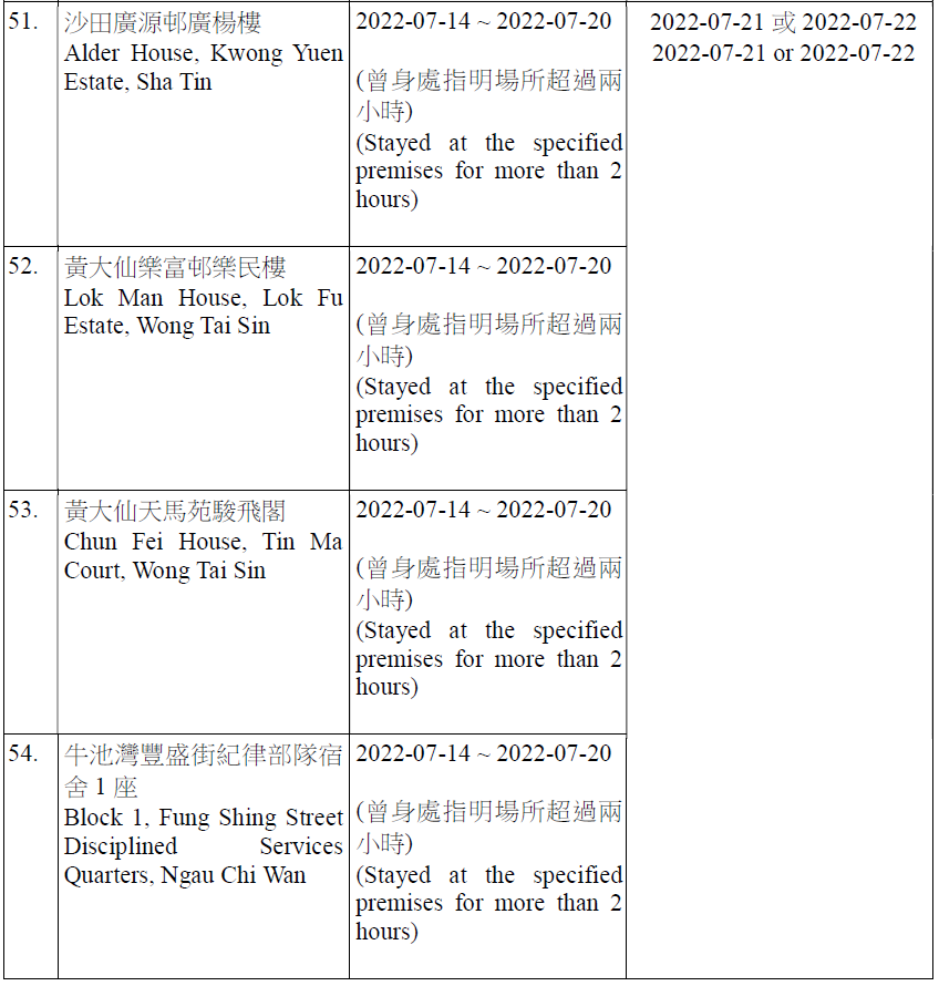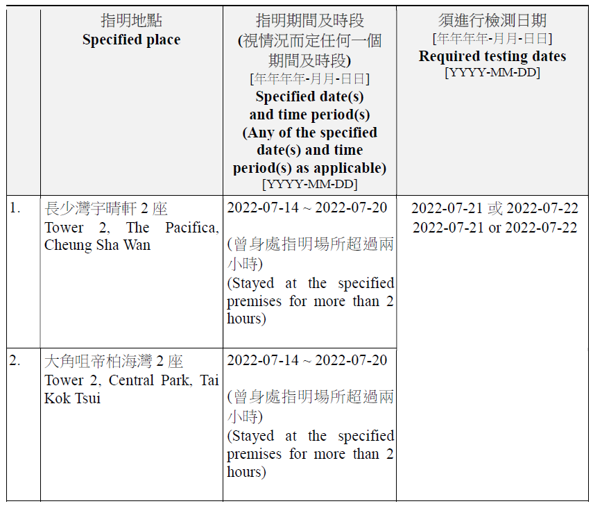 因應多宗陽性檢測個案,及採集到檢測呈陽性的污水樣本,港府今晚(20日)就強制檢測公告刊憲,要求於指定期間曾身處63個指明地方的人士,接受核酸檢測,包括長少灣宇晴軒2座、大角咀帝柏海灣2座、西營盤東邊街14-16號、將軍澳日出康城MALIBU 2A及2B座、黃大仙黃大仙下邨龍慧樓、牛頭角彩福邨彩和樓、將軍澳景林邨景榕樓、將軍澳明德邨明道樓、屯門嘉悅半島1座、沙田新田圍邨欣圍樓等。