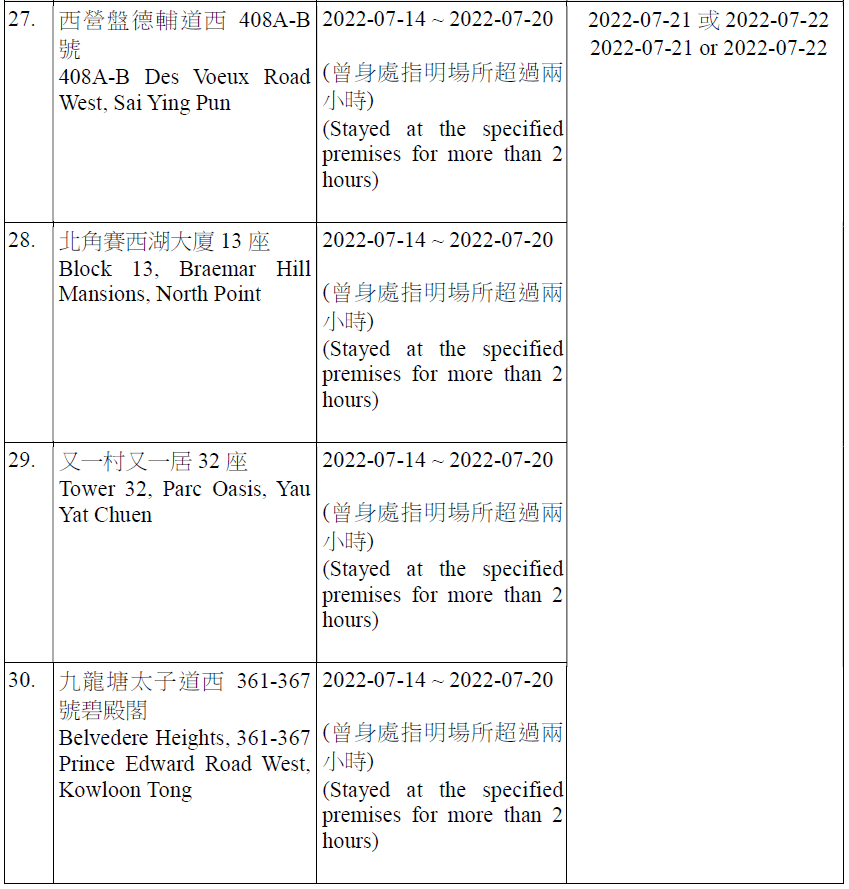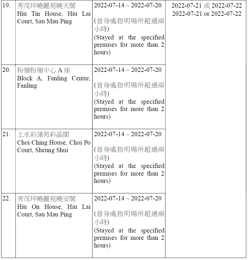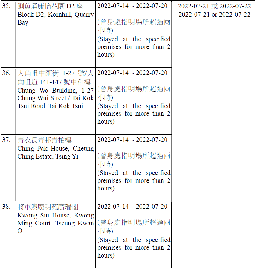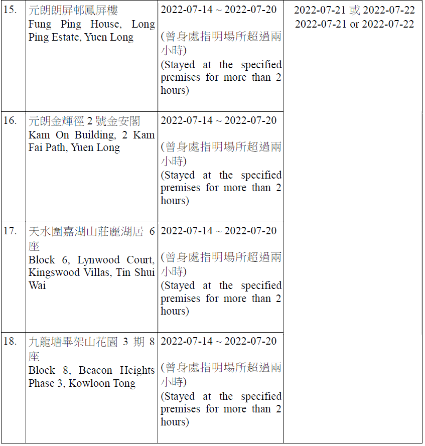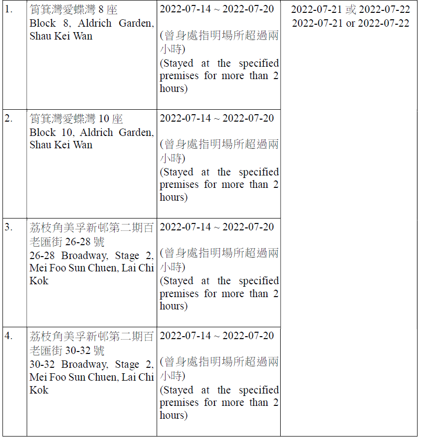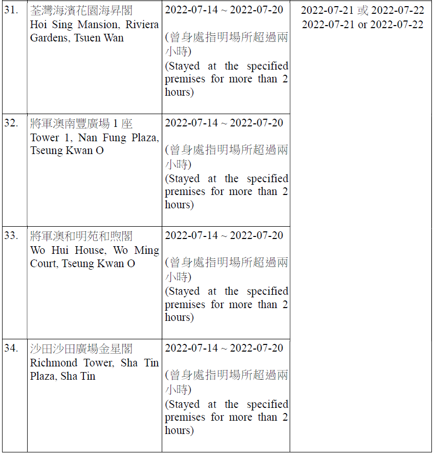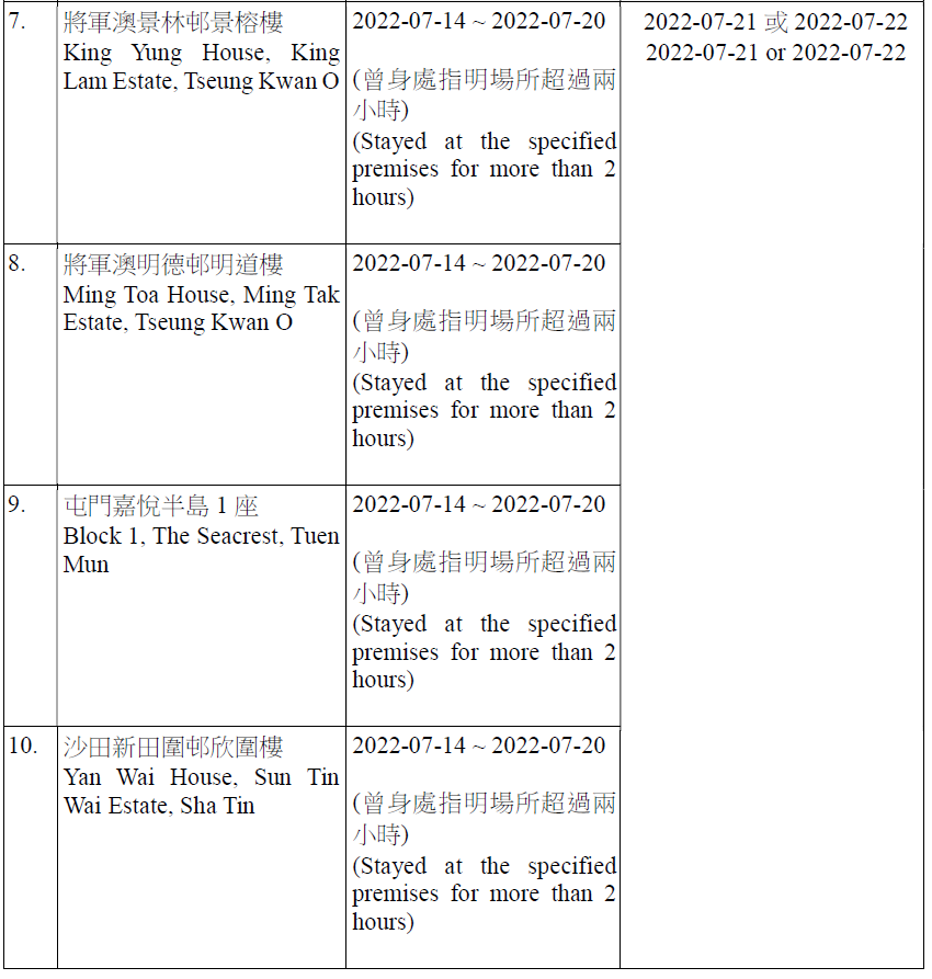 因應多宗陽性檢測個案,及採集到檢測呈陽性的污水樣本,港府今晚(20日)就強制檢測公告刊憲,要求於指定期間曾身處63個指明地方的人士,接受核酸檢測,包括長少灣宇晴軒2座、大角咀帝柏海灣2座、西營盤東邊街14-16號、將軍澳日出康城MALIBU 2A及2B座、黃大仙黃大仙下邨龍慧樓、牛頭角彩福邨彩和樓、將軍澳景林邨景榕樓、將軍澳明德邨明道樓、屯門嘉悅半島1座、沙田新田圍邨欣圍樓等。