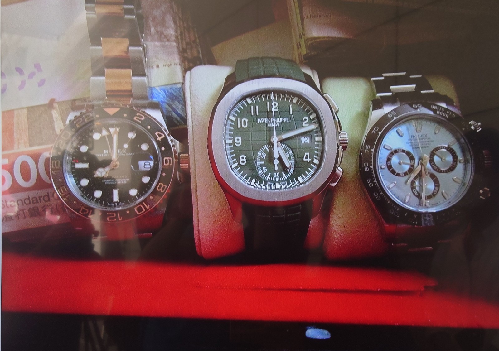 警方在行動中搜出200萬元現金、10隻共值350萬元的名貴手表、兩輛共值240萬元的名貴跑車,另外緝獲釣魚機、麻雀枱、手機、電腦和用作洗黑錢的銀行戶口文件及多張提款卡。