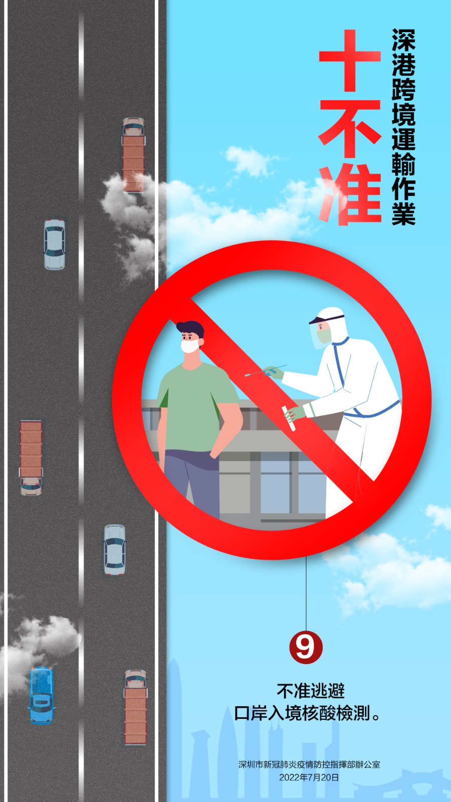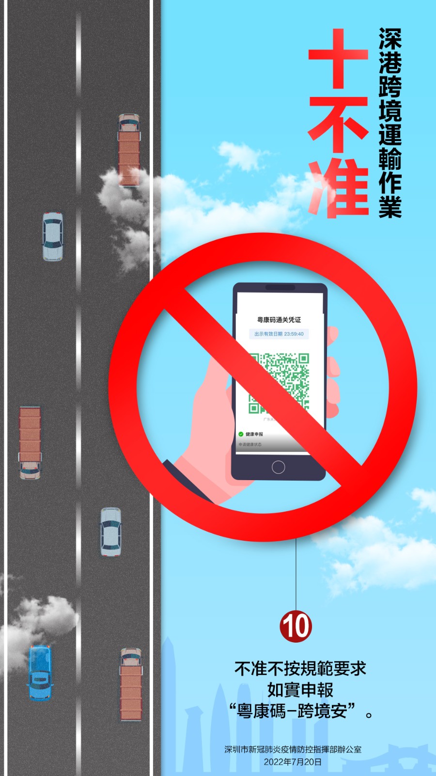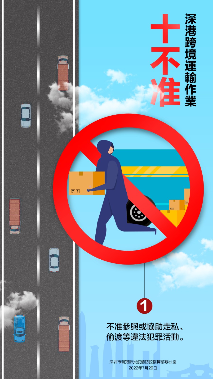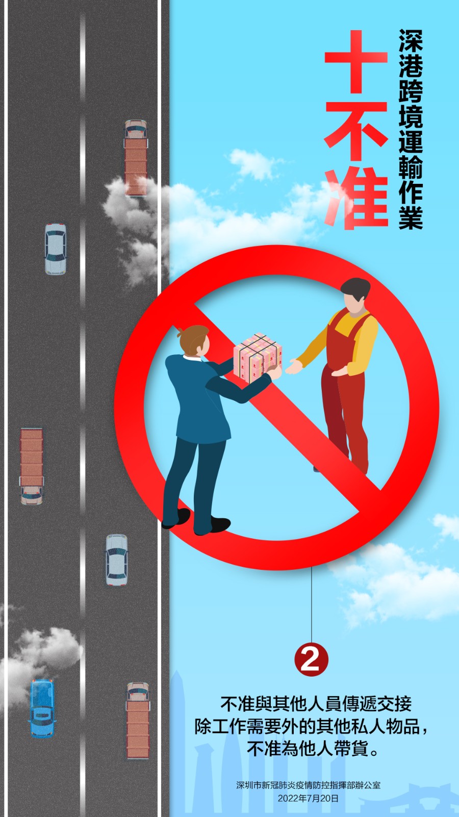 7月20日,深圳市新冠肺炎疫情防控指揮部辦公室發布關於嚴厲打擊深港跨境貨物運輸違法違規行為的通告,就深港跨境運輸作業要求「十不准」。不遵守相關規定及違反其他防疫規定的跨境貨車司機,按規定取消豁免資格,擺渡接駁司機和作業司機取消作業資格;對情節嚴重,涉嫌違法犯罪的,依法追究法律責任。