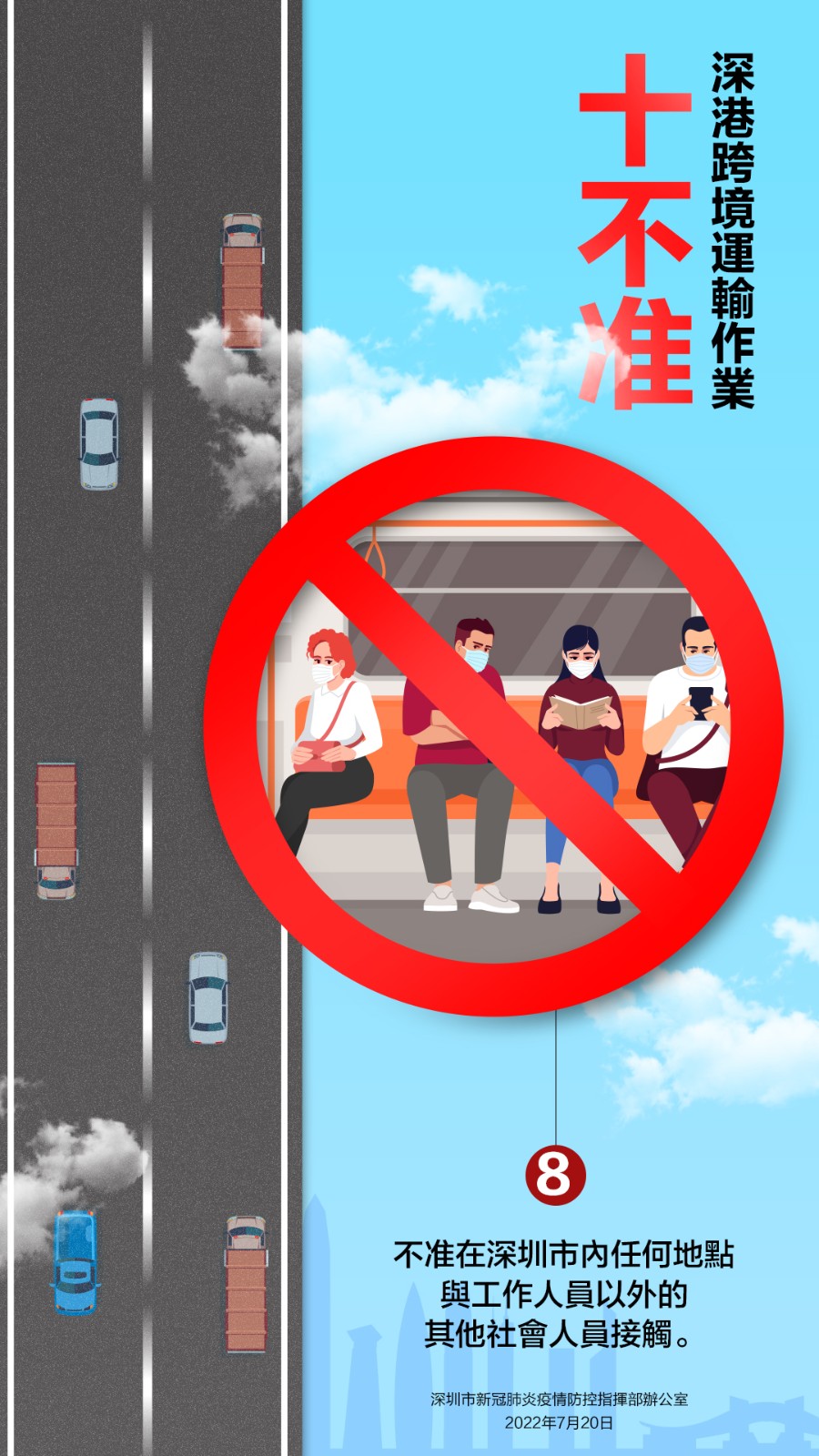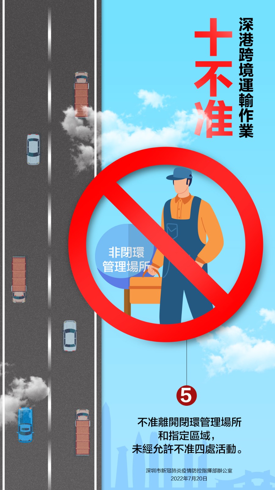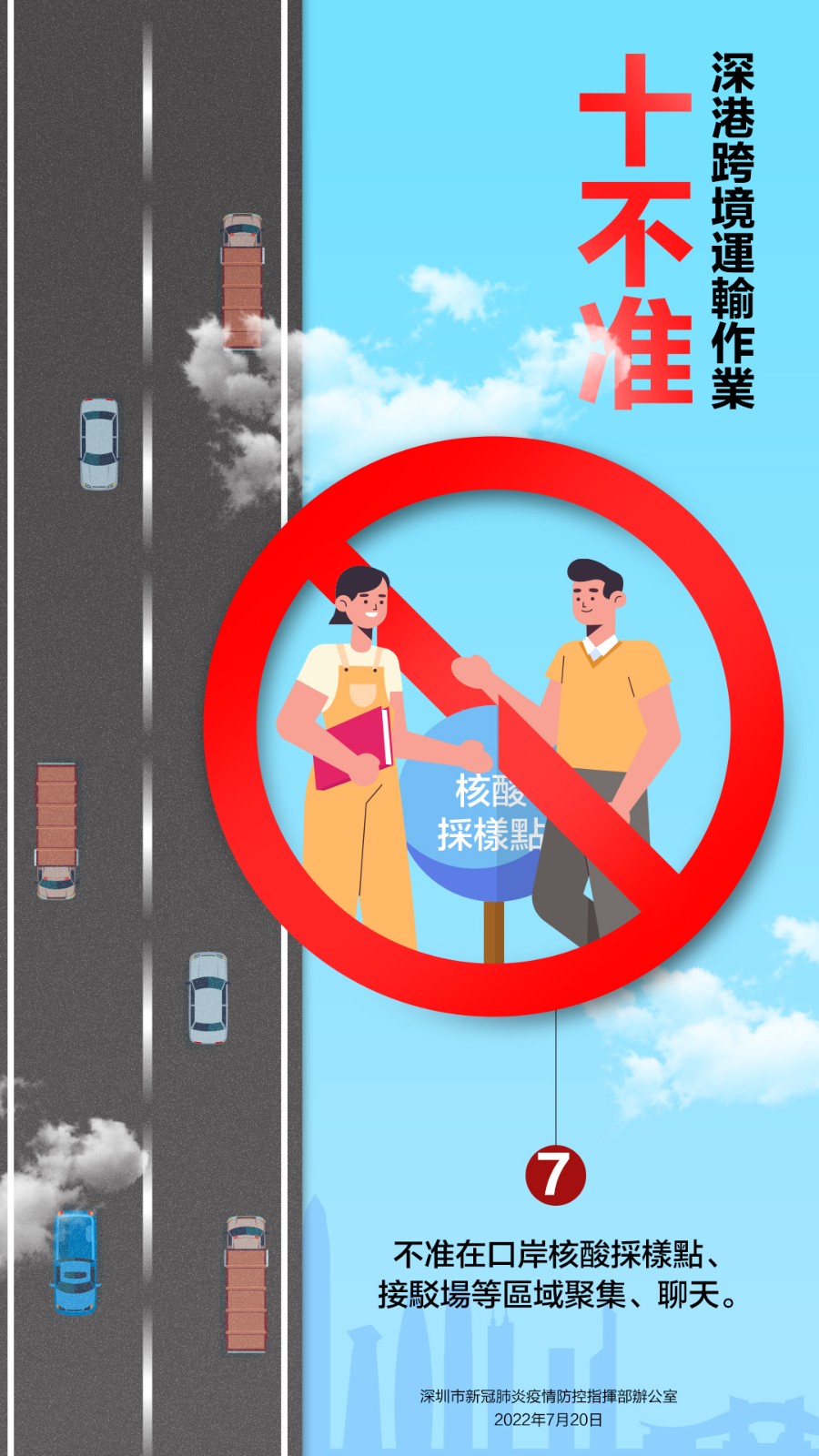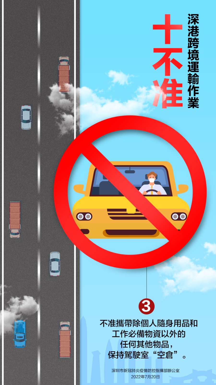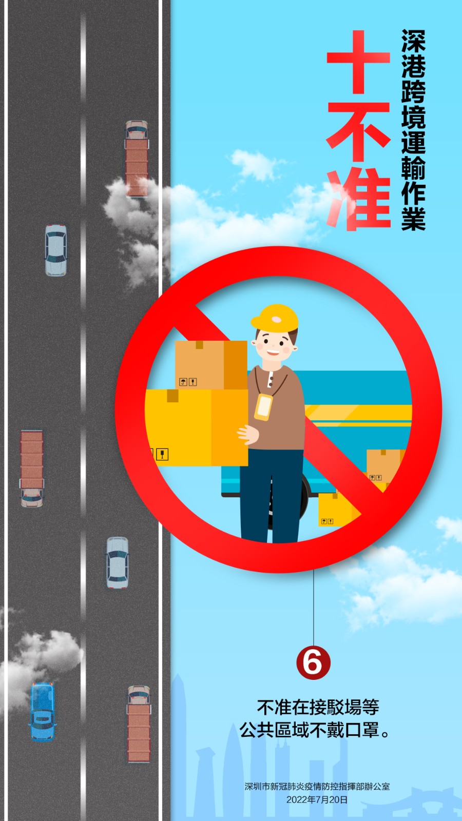 7月20日,深圳市新冠肺炎疫情防控指揮部辦公室發布關於嚴厲打擊深港跨境貨物運輸違法違規行為的通告,就深港跨境運輸作業要求「十不准」。不遵守相關規定及違反其他防疫規定的跨境貨車司機,按規定取消豁免資格,擺渡接駁司機和作業司機取消作業資格;對情節嚴重,涉嫌違法犯罪的,依法追究法律責任。