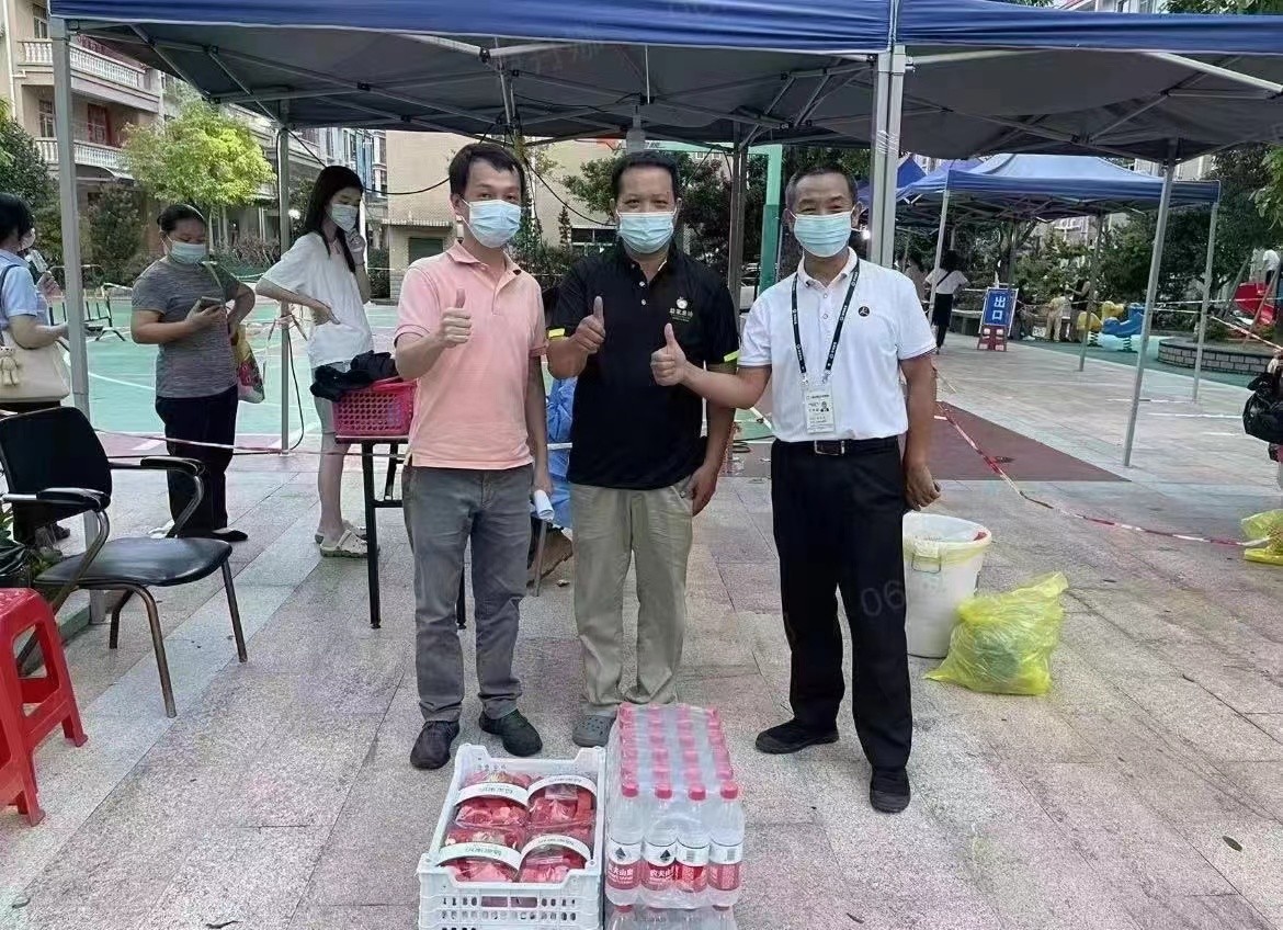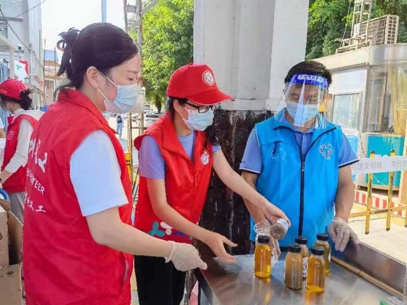 大鵬辦事處各社區送出各種降溫解暑「利器」,如嶺澳社區送出親手熬製的糖水、大鵬社區送出藿香正氣水、下沙社區送出解暑小食、布新社區送出過橋米線、鵬城社區送出各種解暑飲料、王母和水頭社區分別送出涼茶……據統計,7個社區共派發各種降溫解暑物資270餘份,有效幫助高溫作業的防疫人員消暑降溫。愛心企業也紛紛加入「送清涼」的隊伍,在萬方核酸檢測點,愛心企業益家果行送來礦泉水和西瓜,在佳兆業核酸點還「上演」了暖心一幕,一位男性愛心市民放下一箱飲料轉頭就走……