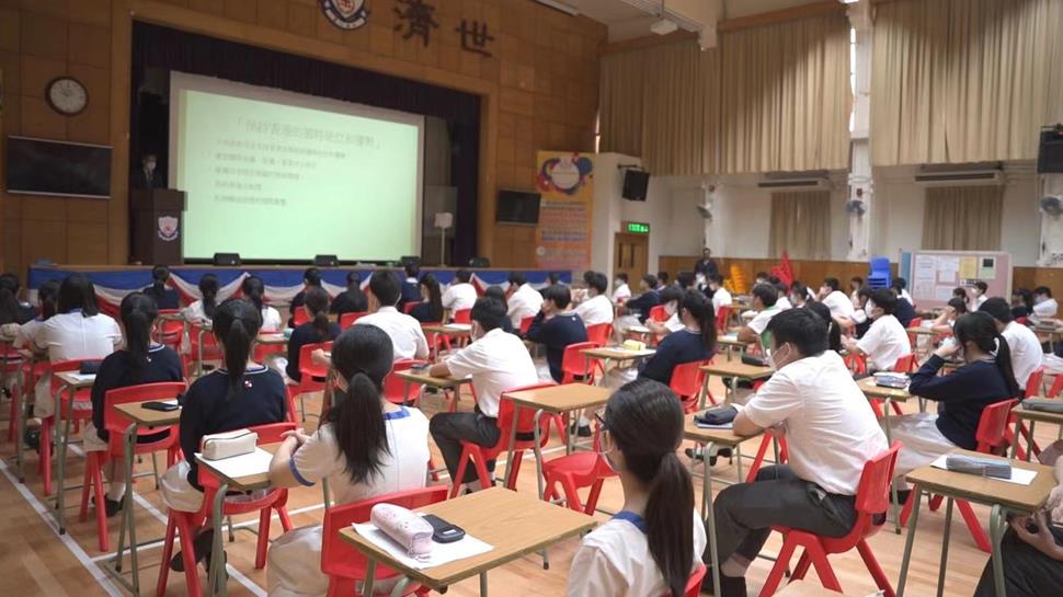 仁濟醫院王華湘中學的同學們正在聽校長分享的宣講內容