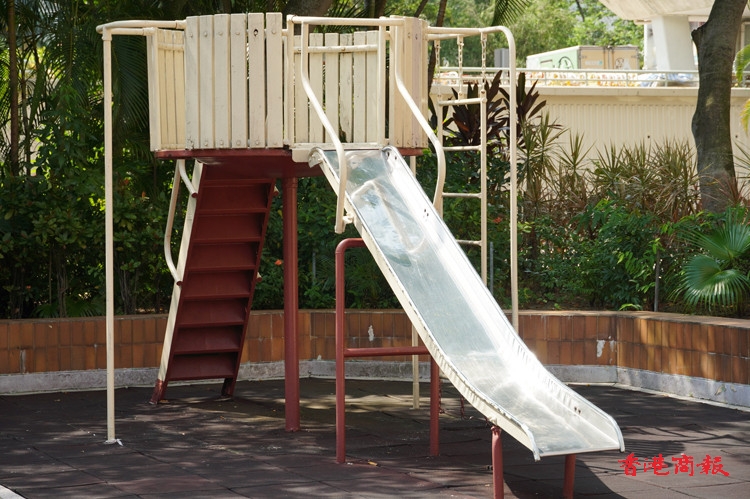 位於新界東某屋苑,現在仍碩果僅存一些舊式玩樂設施,例如螺旋形鐵滑梯,蝸牛形、蜈蚣形狀攀爬架,以及垂直式鐵滑梯。這些設施主要是用金屬製造,在烈日下會變成熾熱的鐵板。雖然這些懷舊娛樂場設施已屬過時產品,但對一些曾經被鐵板「焫」過的小朋友,一定另有一番回味。(記者 馮俊文攝)