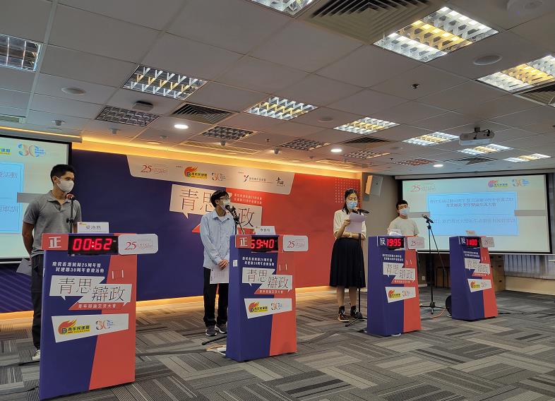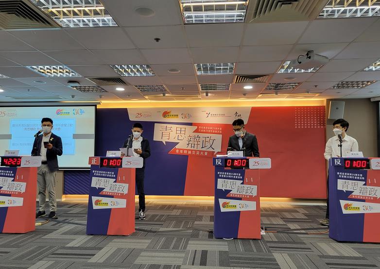 青年民建聯昨日(30日)舉辦「慶祝香港回歸25周年暨民建聯30周年會慶活動—青思辯政青年辯論大會」,16名參賽者分成4組分別辯論「政府規定大學新生必須參加短期軍訓」、「政府應豁免青年首置印花稅」、「青年宿舍有助青年建立置業階梯」及「教育局應把STEAM列為必修科目」四個辯題,藉此提供平台讓有志青年表現自我,就不同的議題進行交流和辯論,提升議政論政能力及為未來的發展做好準備。