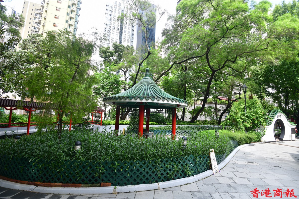 上環荷里活道公園四周都被商業大廈圍繞,在商業味濃的地區中,這個充滿中國特色設計的公園,的確令人眼前一亮。