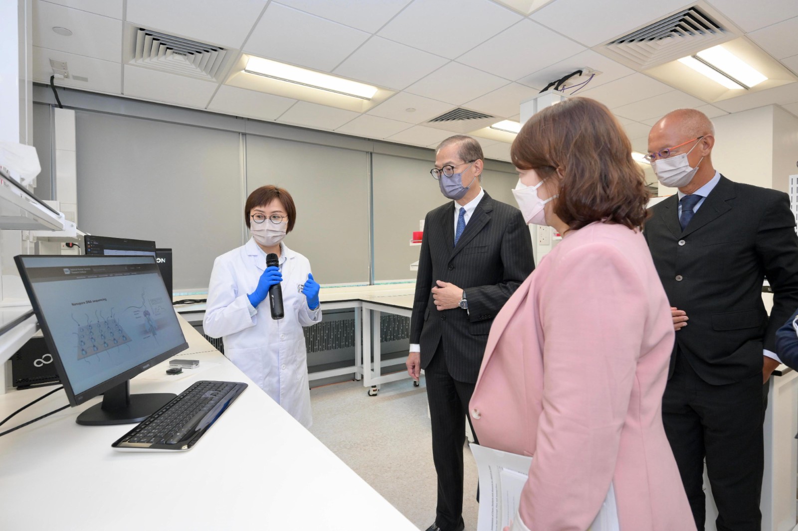 盧寵茂在香港基因組中心董事局主席蔡永忠、副主席梁憲孫和行政總裁羅思偉陪同下,參觀香港基因組中心的實驗室。