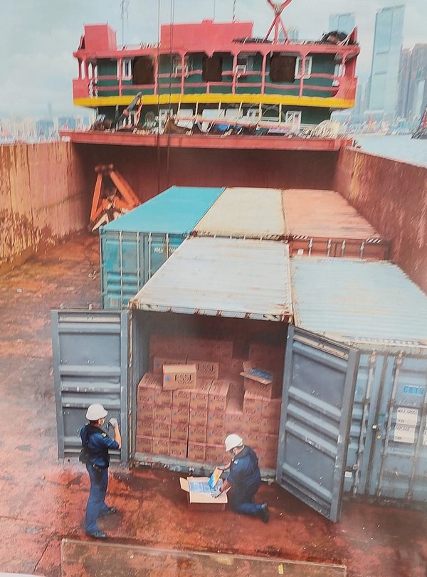 海關搗破一宗私煙案。海關海域行動組署理高級督察王芷欣今日(11日)表示,本月5日根據風險管理和數據分析,發現一艘躉船懷疑進行走私活動,在當日早上10時許,海域行動組人員在昂船洲對開將目標躉船截停並登船搜查,當時船上共有6名船員,報稱將5個貨櫃運往油麻地卸貨區。關員調查期間船主無法提供貨櫃的資料和文件,而其中3個貨櫃的編號是無效,關員打開貨櫃後發現有不同牌子的未完稅香煙,隨即將6名船員拘捕。