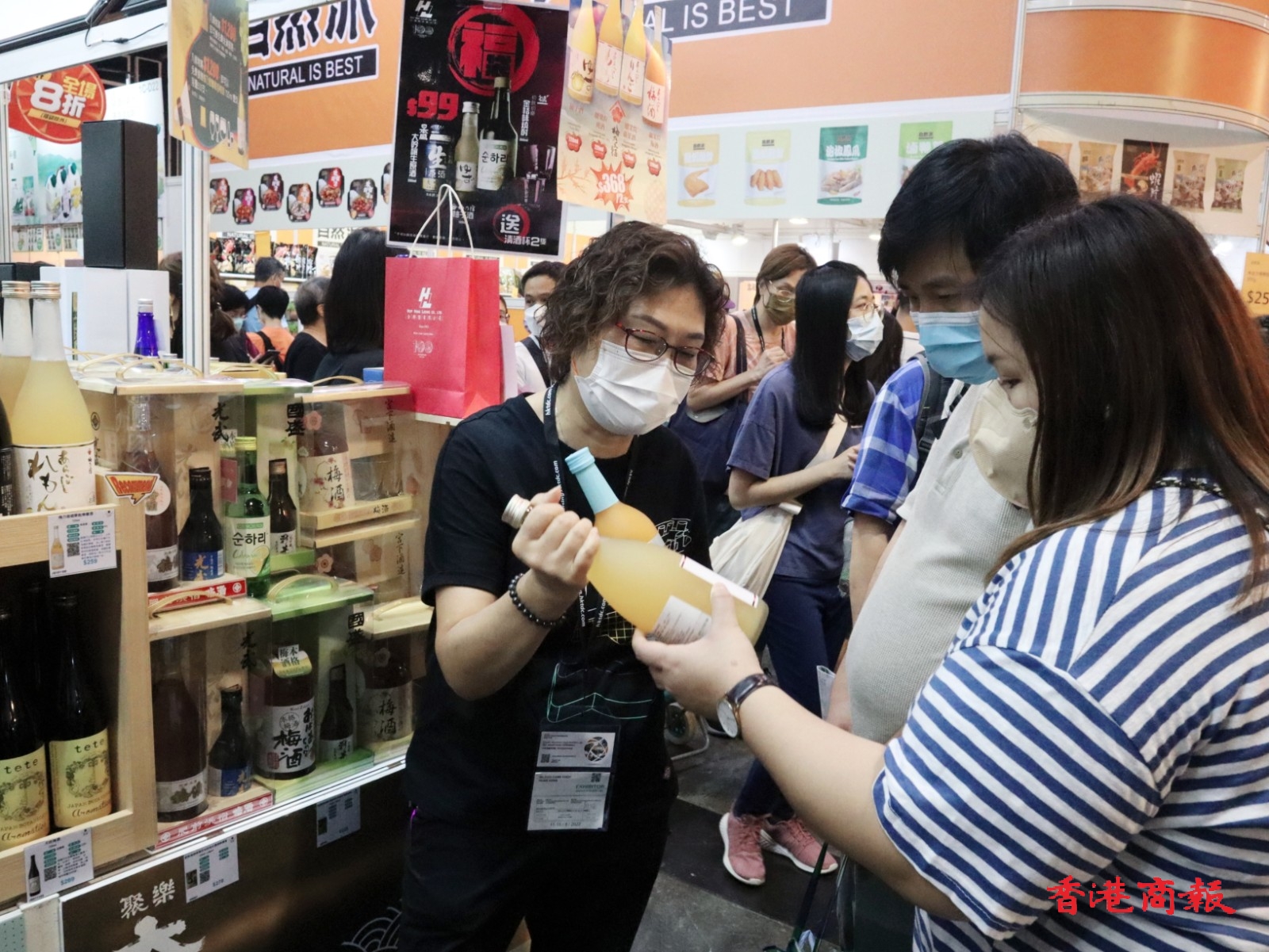 另外一個售賣日本酒的攤位也圍滿市民,負責人連先生表示,今年的生意額比去年上升三成,主要受到消費券的帶動,但現場只有首兩日有約一成半至兩成人用消費券付款,到星期六開始大家也轉用信用卡付款,估計是消費券已花得七七八八。今年人流明顯較多,他認為有疫情前的六至七成,因大家習慣了疫情,不像去年那樣害怕。連先生指,今年歐元及日圓也下跌,故推出全場八折再送酒版吸引市民,又認為大家在購物時比往年手鬆,更有客人豪花4萬元購買多款日本酒。