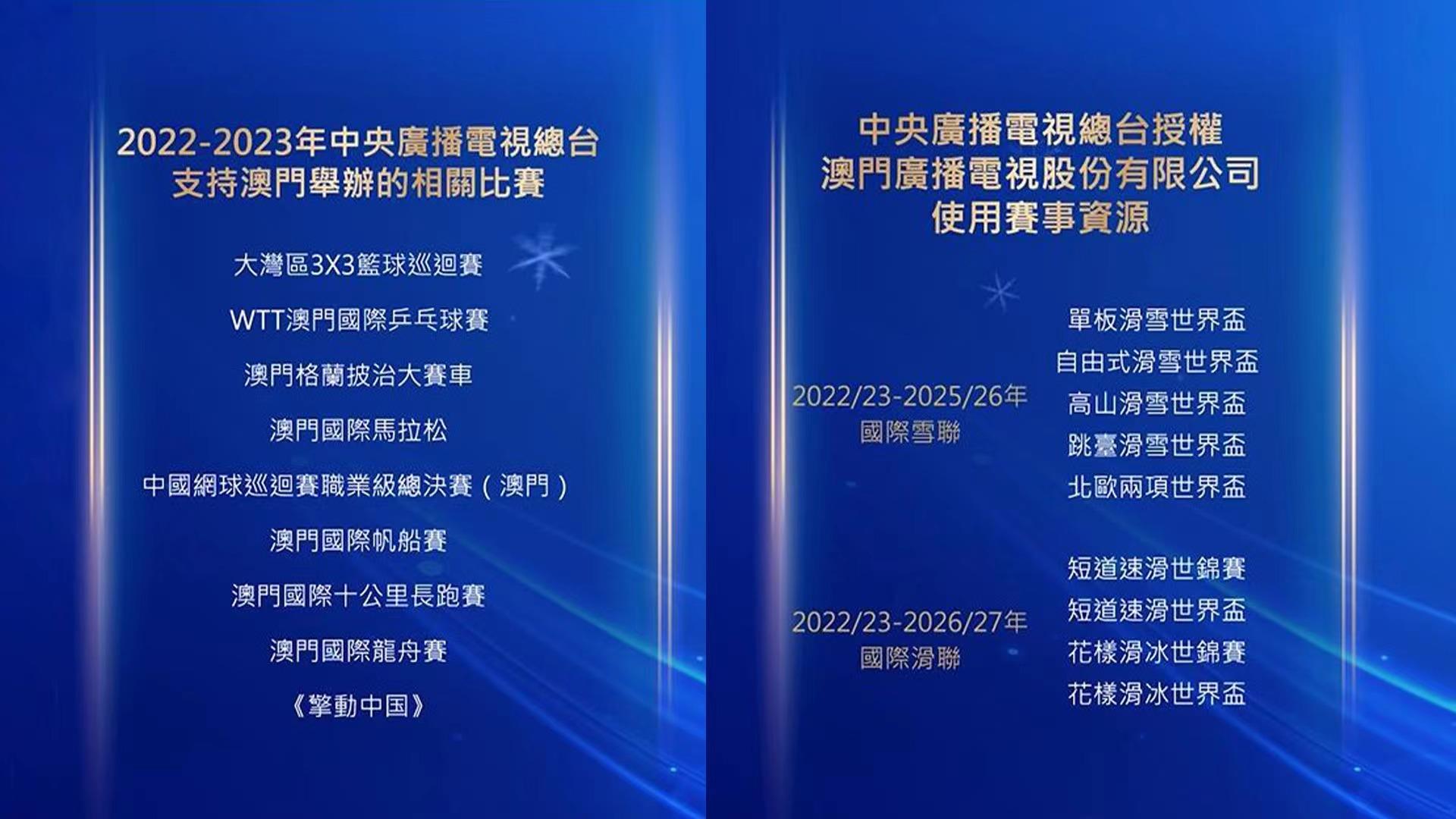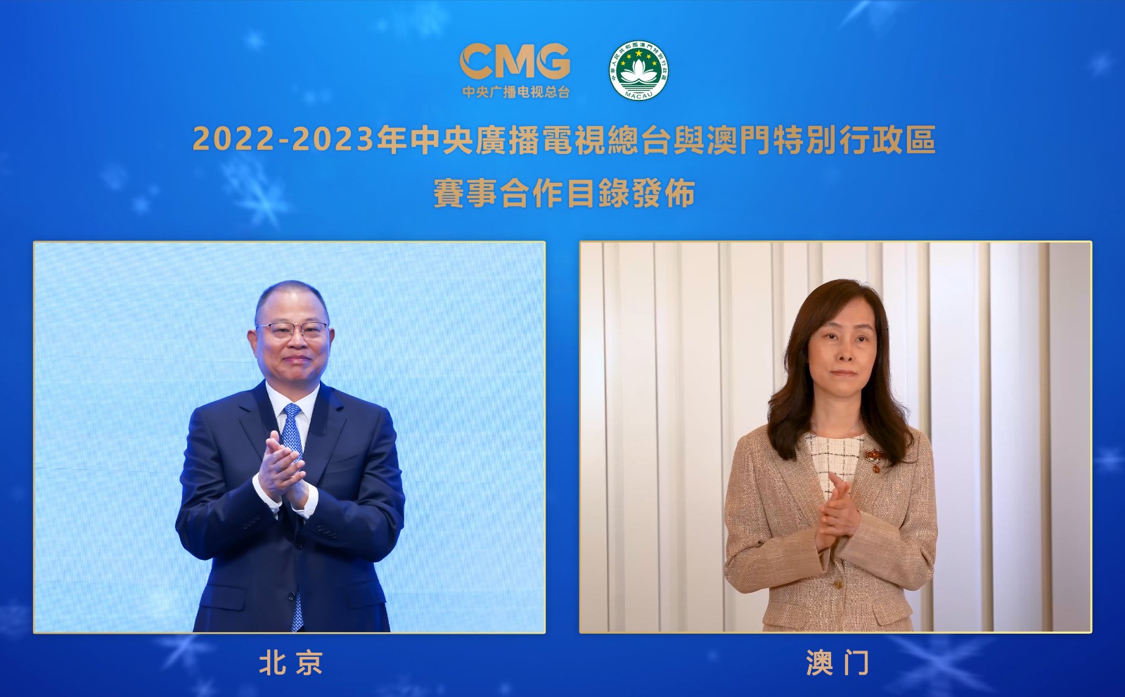 中央廣播電視總台編務會議成員薛繼軍與澳門特別行政區社會文化司司長歐陽瑜共同發布了《2022-2023年中央廣播電視總台與澳門特別行政區賽事合作目錄》,雙方將進一步強化在體育賽事舉辦和賽事資源授權方面的合作。
