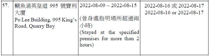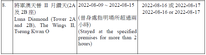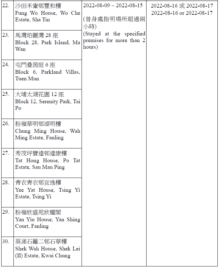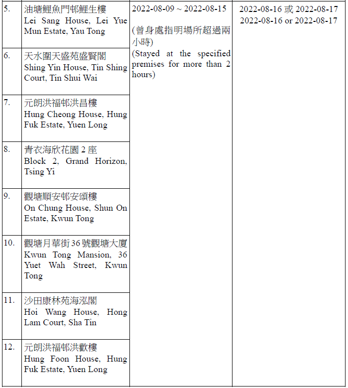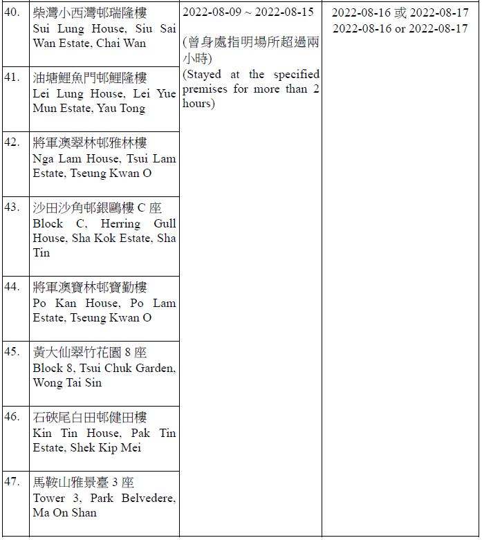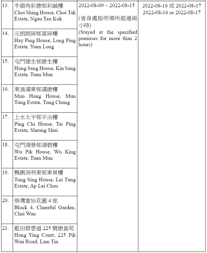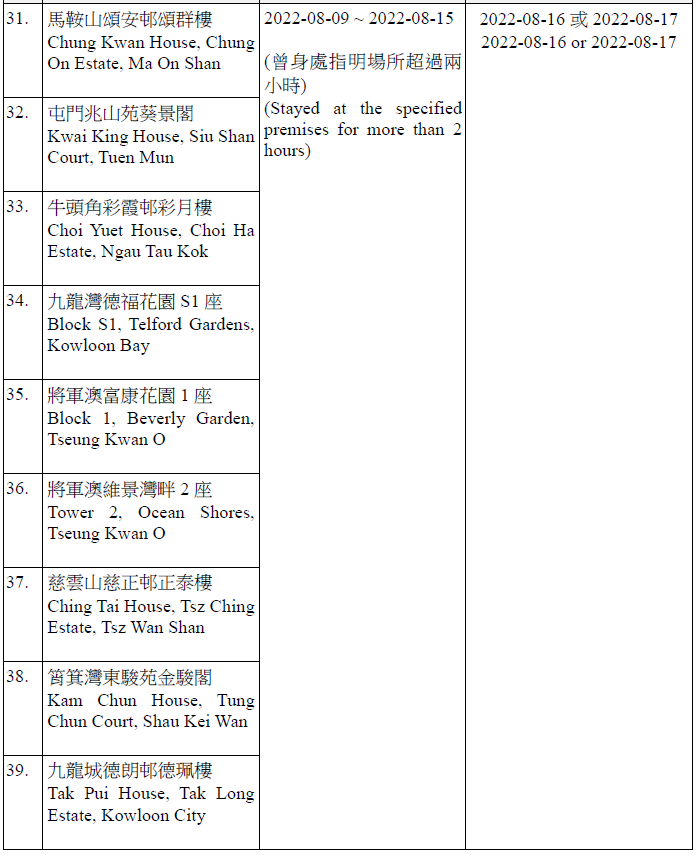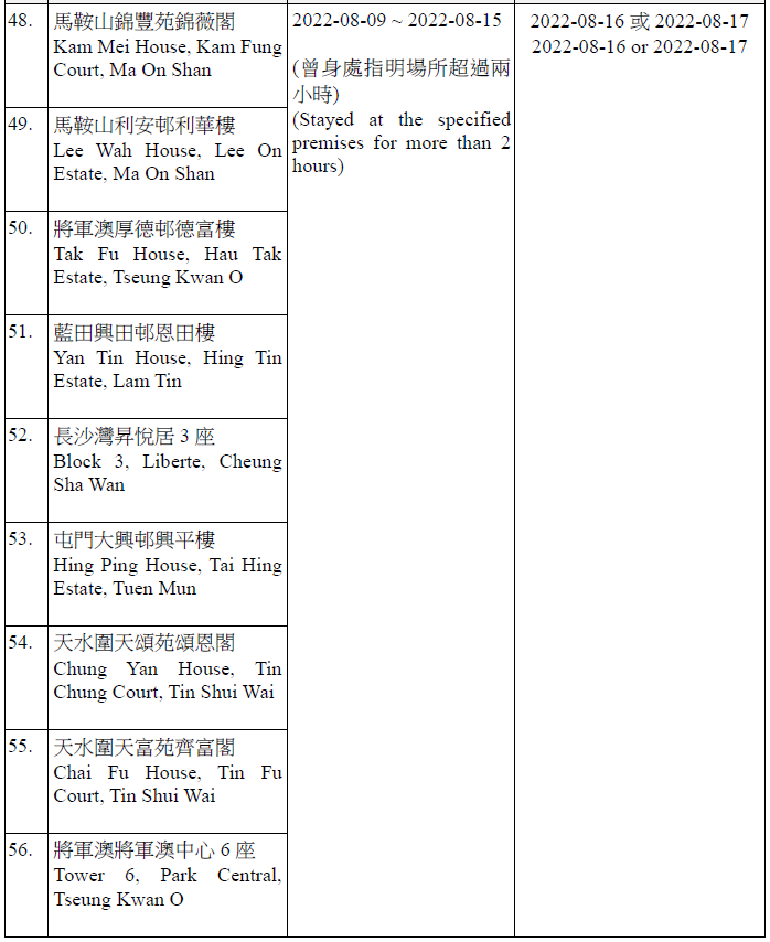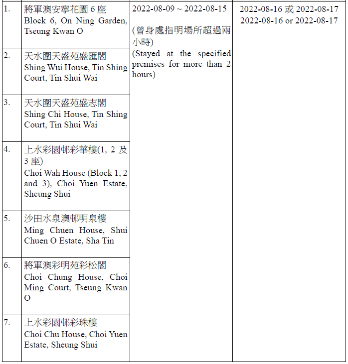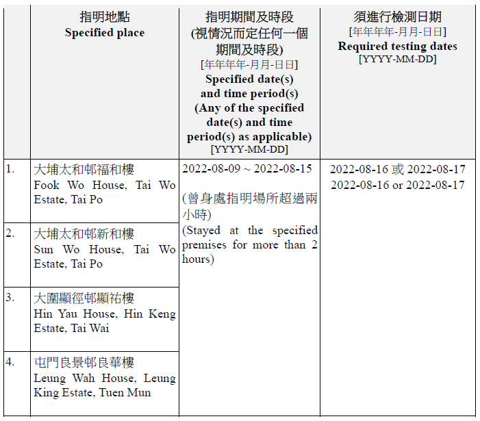因應多宗陽性檢測個案,及採集到檢測呈陽性的污水樣本,港府今晚(15日)就《規例》下的強制檢測公告刊憲,要求於指定期間曾身處65個指明地方的人士,接受核酸檢測,包括大埔太和邨福和樓、大埔太和邨新和樓、大圍顯徑邨顯祐樓、屯門良景邨良華樓、油塘鯉魚門邨鯉生樓、天水圍天盛苑盛賢閣、元朗洪福邨洪昌樓、青衣海欣花園2座、觀塘順安邨安頌樓、觀塘月華街36號觀塘大廈等。