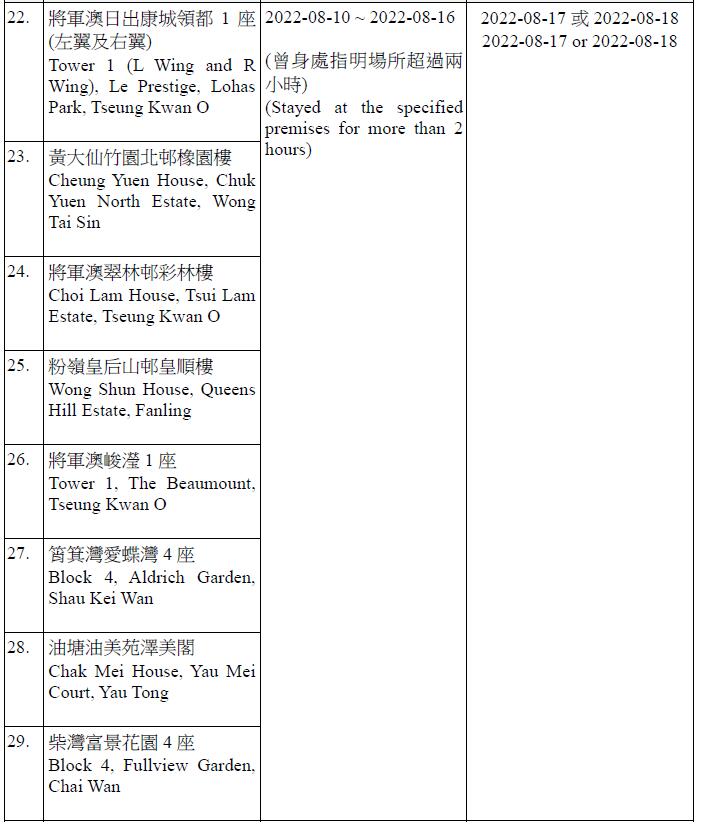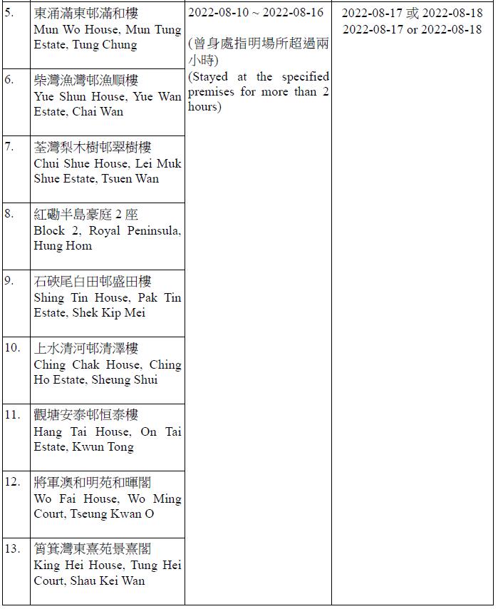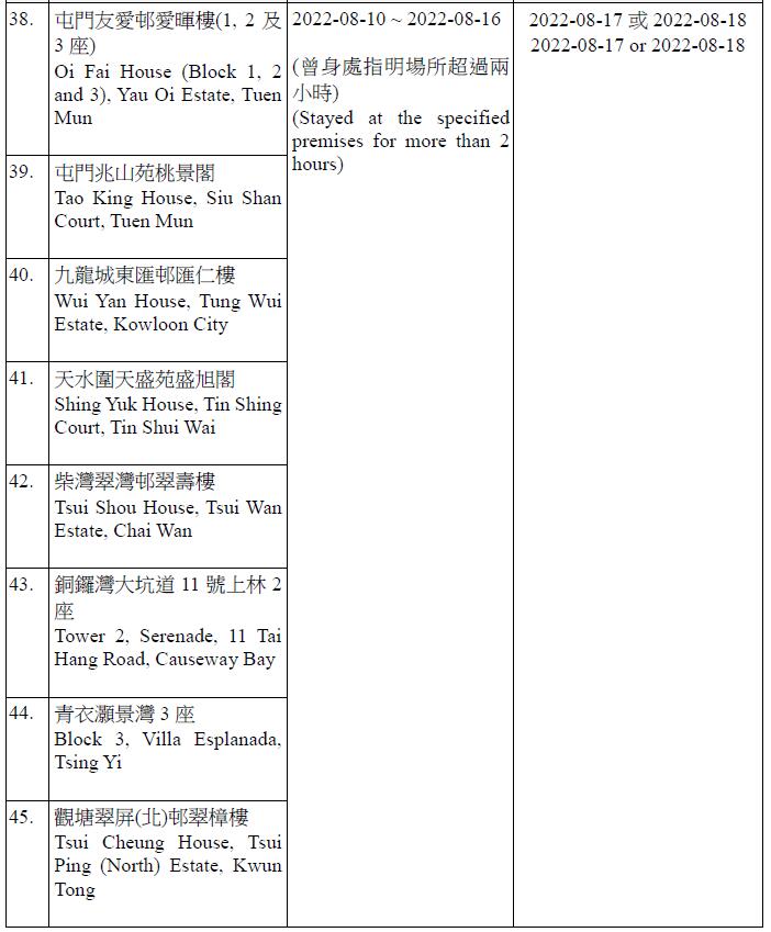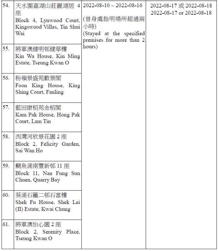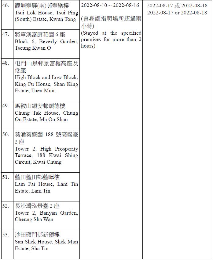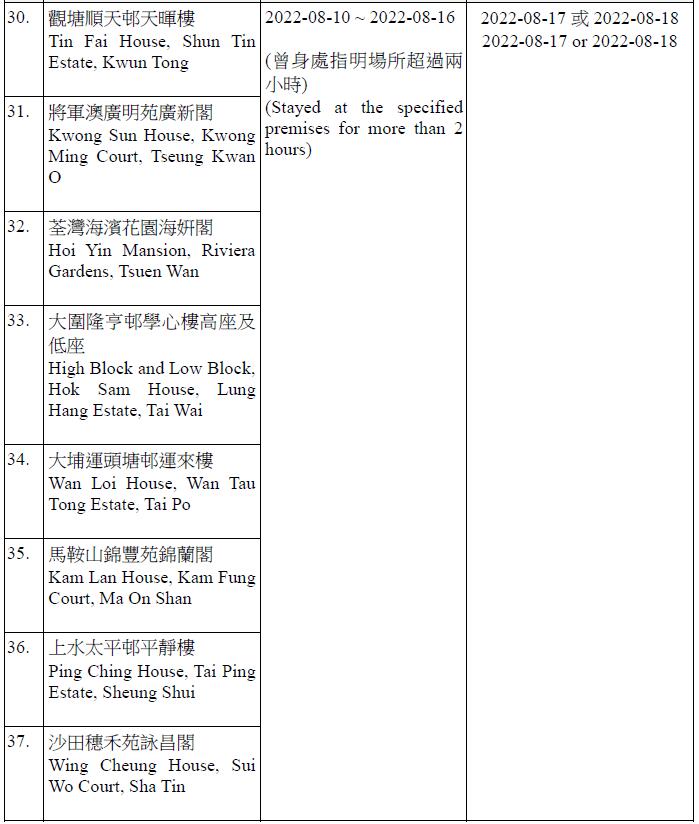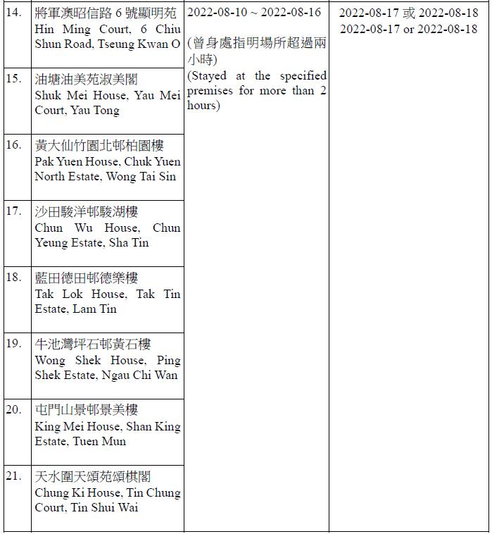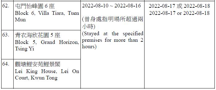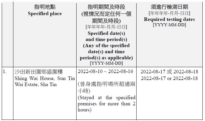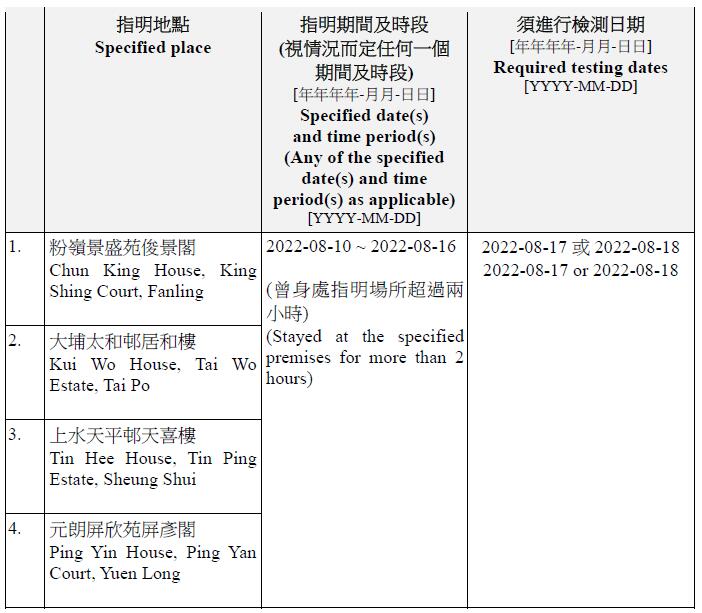 因應多宗陽性檢測個案,及在沙田採集到檢測呈陽性的污水樣本,港府今晚(16日)就《規例》下的強制檢測公告刊憲,要求於指定期間曾身處65個指明地方的人士,接受核酸檢測,包括粉嶺景盛苑俊景閣、大埔太和邨居和樓、上水天平邨天喜樓、元朗屏欣苑屏彥閣、東涌滿東邨滿和樓、柴灣漁灣邨漁順樓、荃灣梨木樹邨翠樹樓、紅磡半島豪庭2座、石硤尾白田邨盛田樓、上水清河邨清澤樓等大廈。