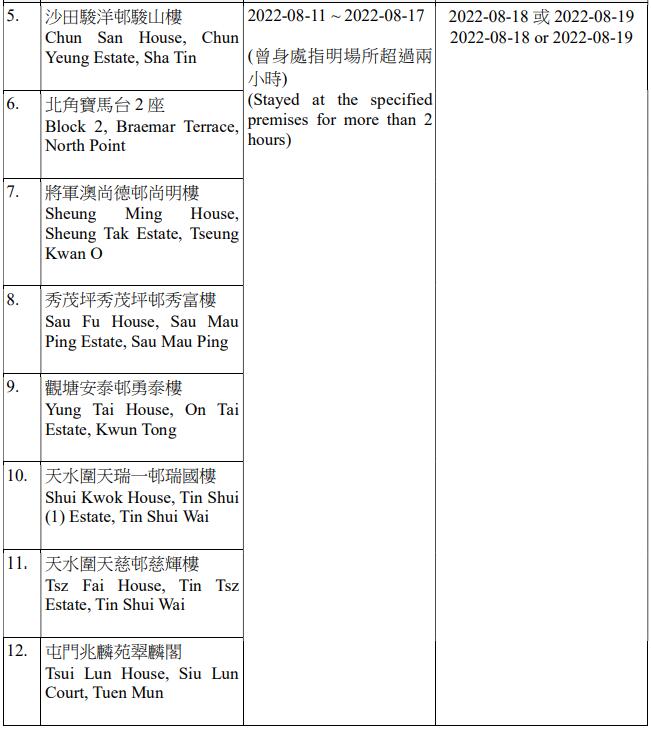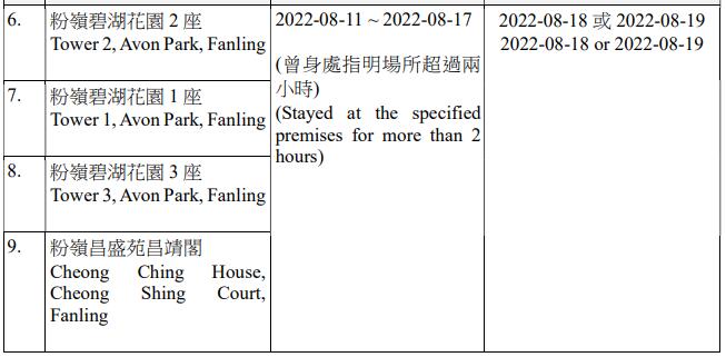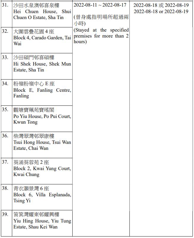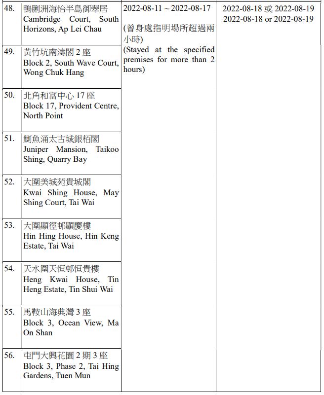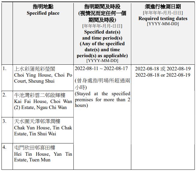 因應多宗陽性檢測個案,及在香港仔及粉嶺採集到檢測呈陽性的污水樣本,港府今晚(17日)就《規例》下的強制檢測公告刊憲,要求於指定期間曾身處65個指明地方的人士,接受核酸檢測,包括上水彩蒲苑彩瑩閣、牛池灣彩雲二邨啟輝樓、天水圍天澤邨澤潤樓、屯門欣田邨喜田樓、沙田駿洋邨駿山樓、北角寶馬台2座、將軍澳尚德邨尚明樓、秀茂坪秀茂坪邨秀富樓、觀塘安泰邨勇泰樓、天水圍天瑞一邨瑞國樓等大廈。