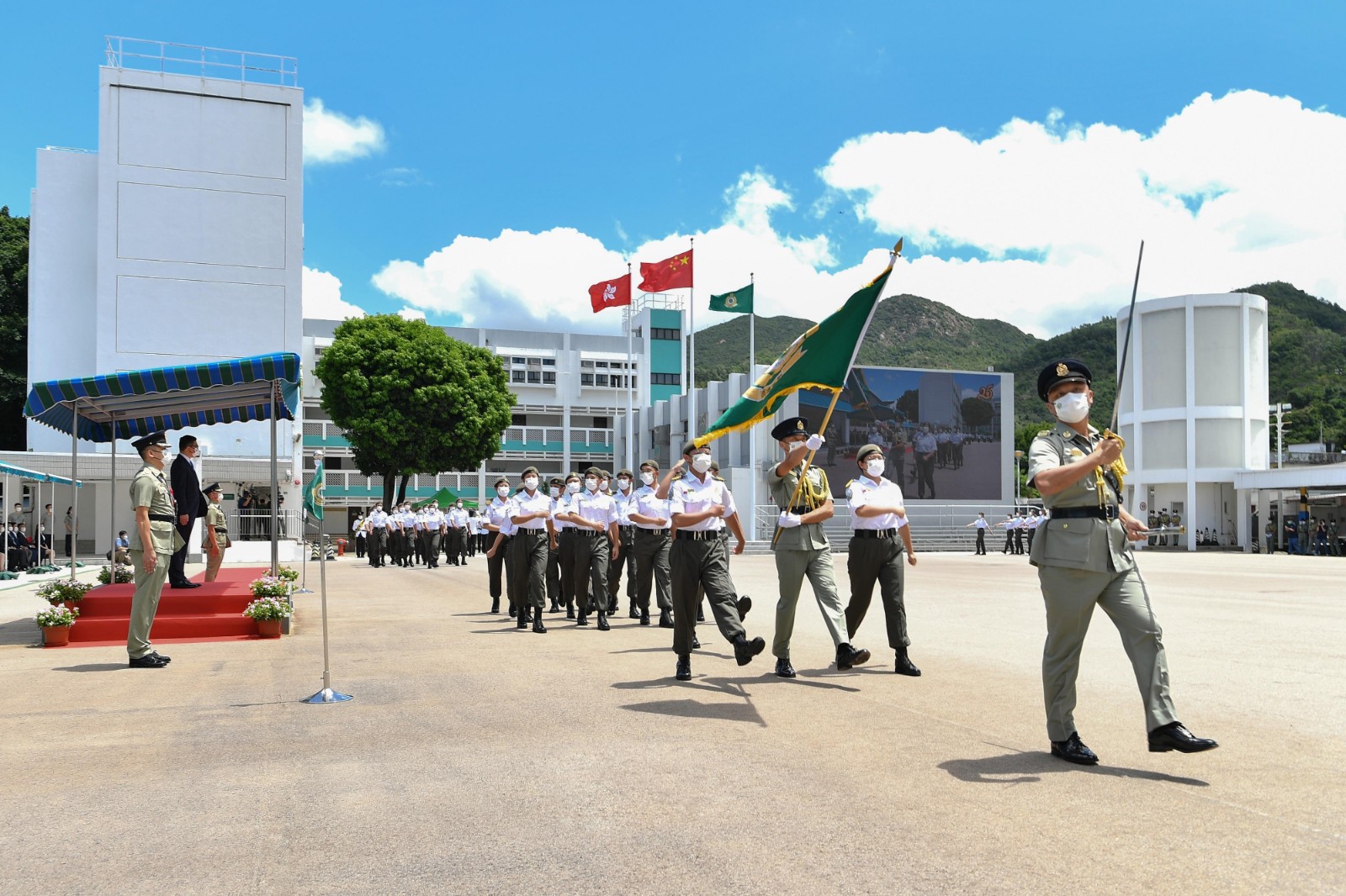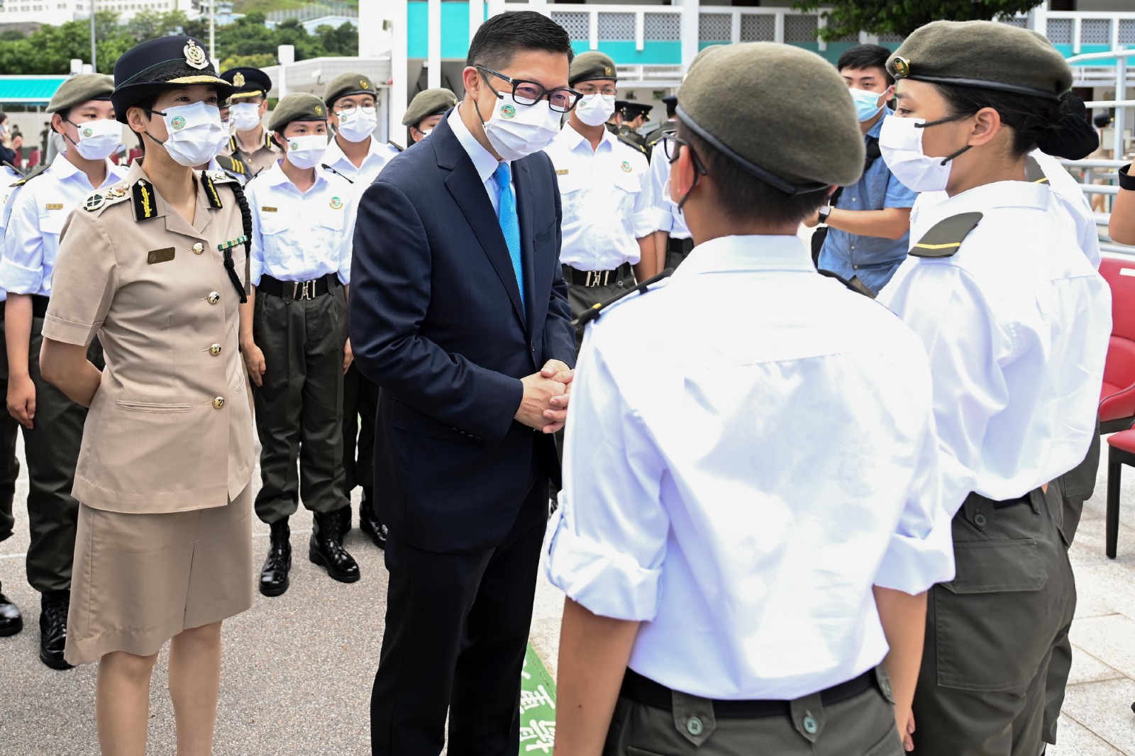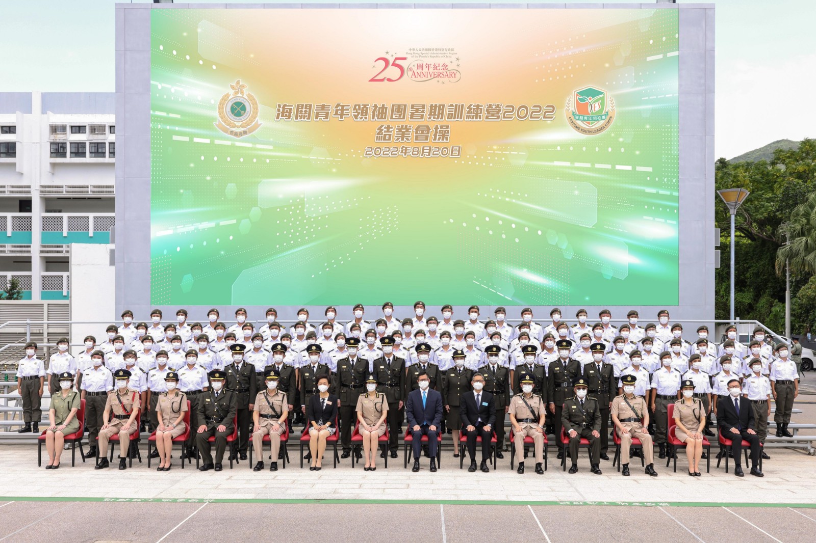 香港海關本周(8月15日至19日)舉辦「海關青年領袖團暑期訓練營2022」,結業會操今日(20日)於香港海關學院舉行。85名完成訓練的團員以中式步操接受保安局局長鄧炳強檢閱。